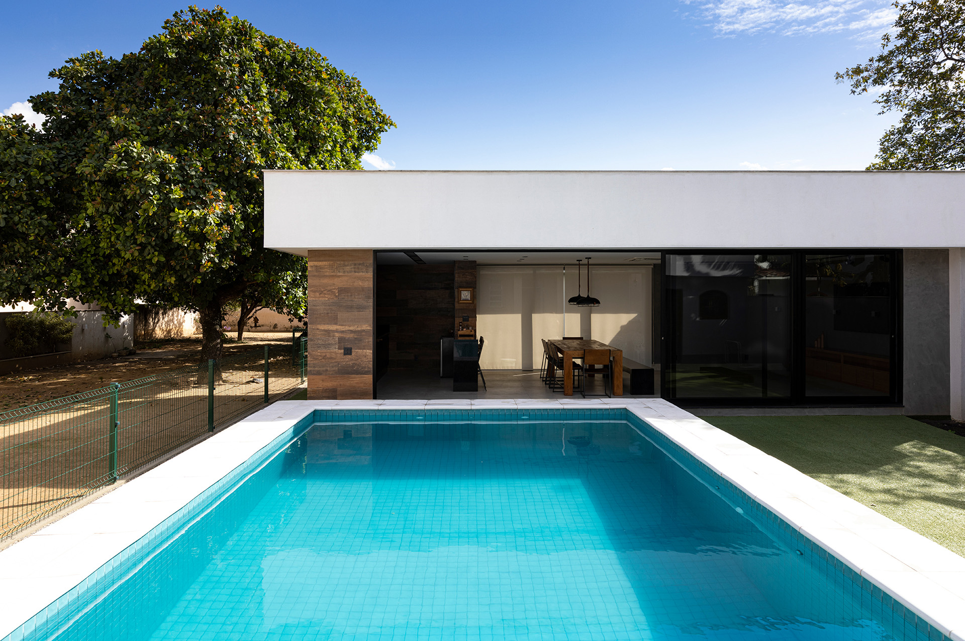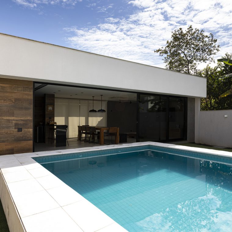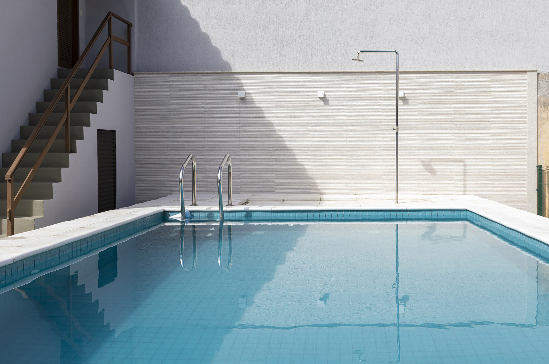 A piscina teve seu dimensionamento estudado e revisto várias vezes, até se chegar na configuração final a ser construída. Um aspecto importante da alocação da piscina é a insolação que, neste caso, foi colocada para receber sol o dia todo.