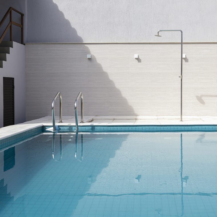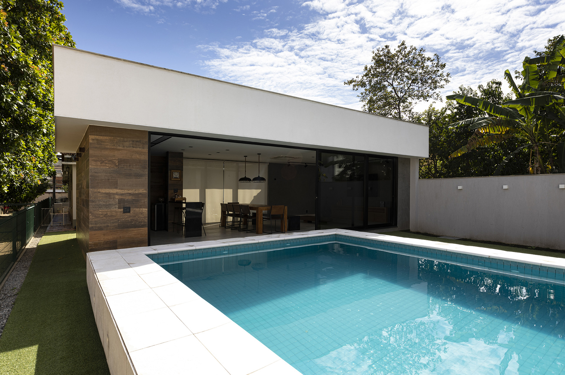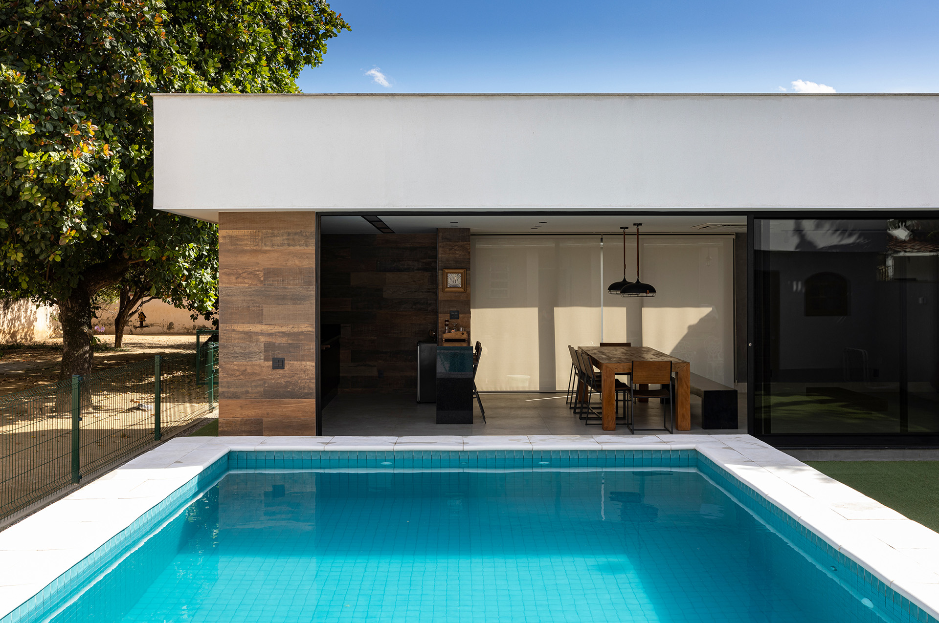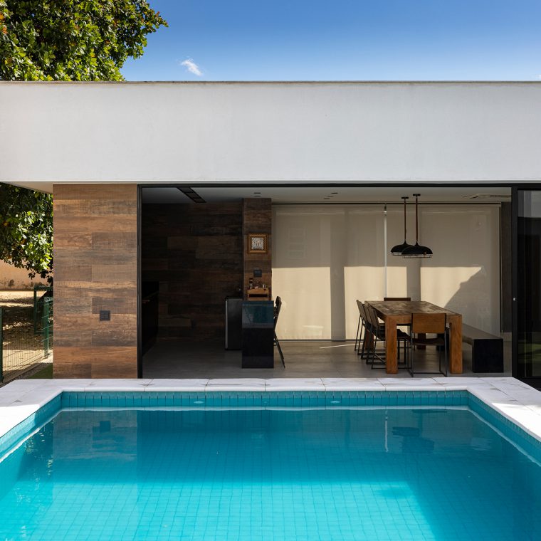 A piscina teve seu dimensionamento estudado e revisto várias vezes, até se chegar na configuração final a ser construída. Um aspecto importante da alocação da piscina é a insolação que, neste caso, foi colocada para receber sol o dia todo.