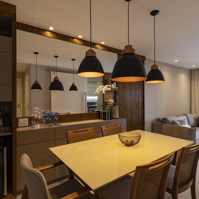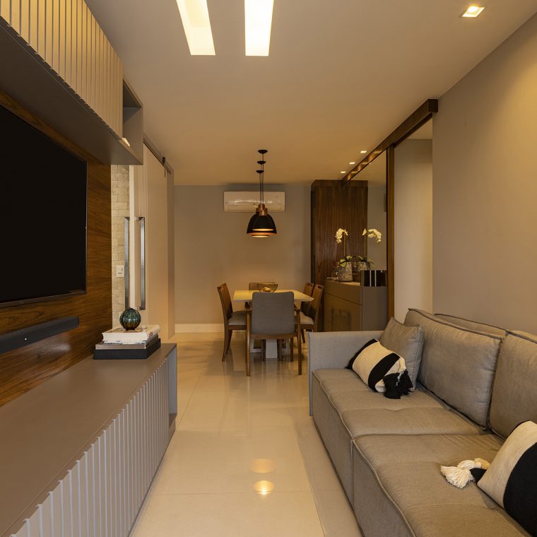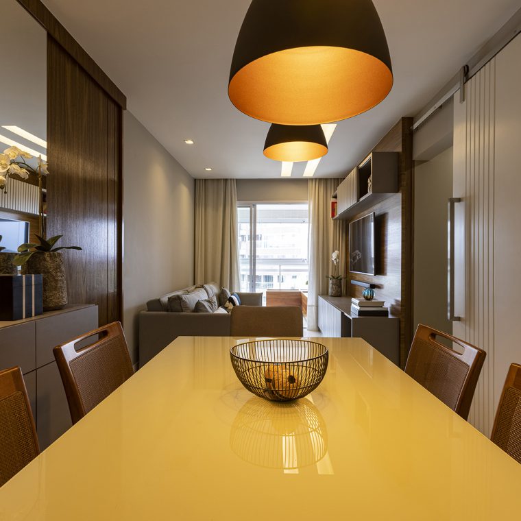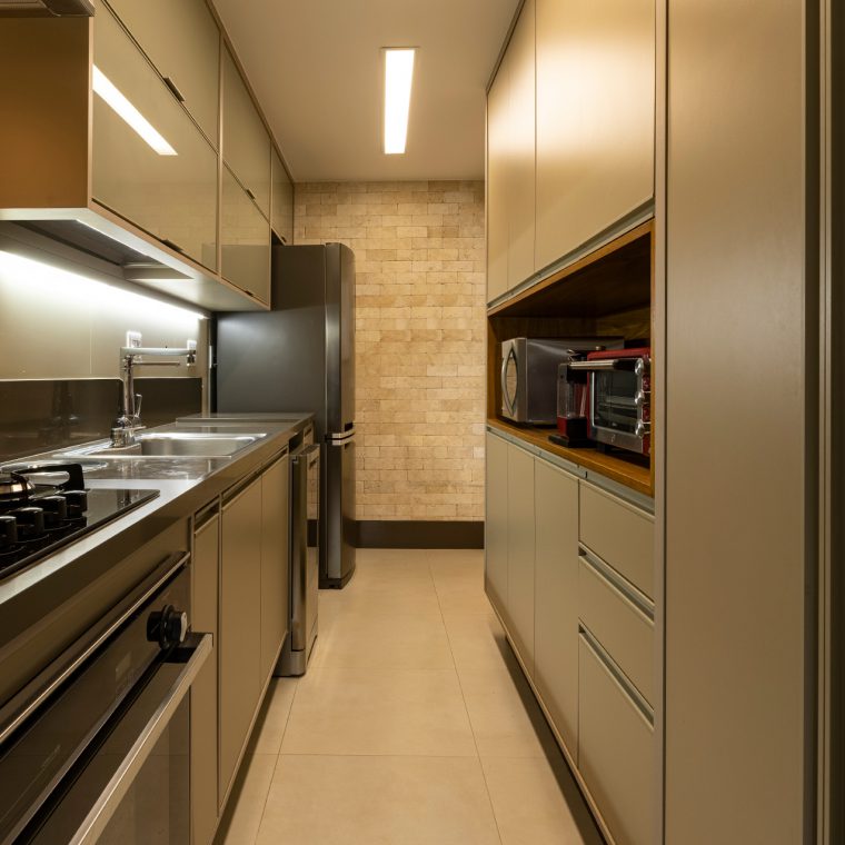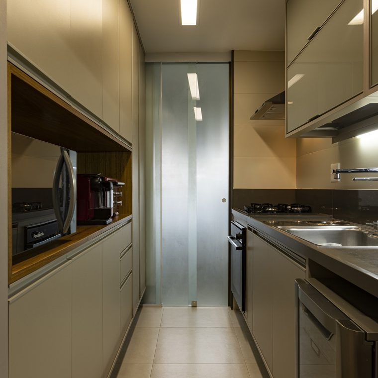 Perfil do projeto: A planta do imóvel sofreu pequenas intervenções. A solução que encontramos para se ter mais armários, principalmente na cozinha e área de serviço, foi a demolição da parede entre a cozinha e sala. Parece pouco, mas o ganho de espessura dessa parede possibilitou a colocação de armários mais funcionais, tanto para a cozinha quanto para a sala.