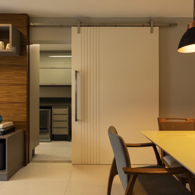 Era um desejo dos clientes que houvesse a integração parcial desses dois cômodos, por isso a criação de uma porta larga, com 140 cm, para dividir esses dois espaços.