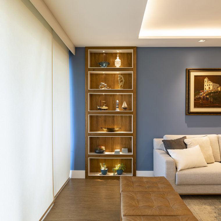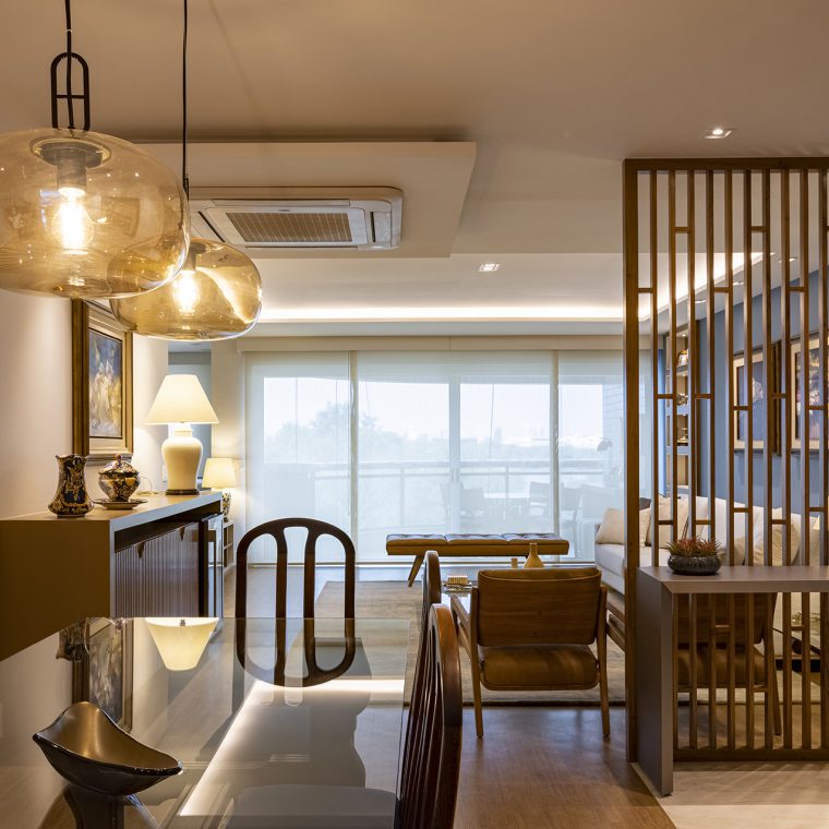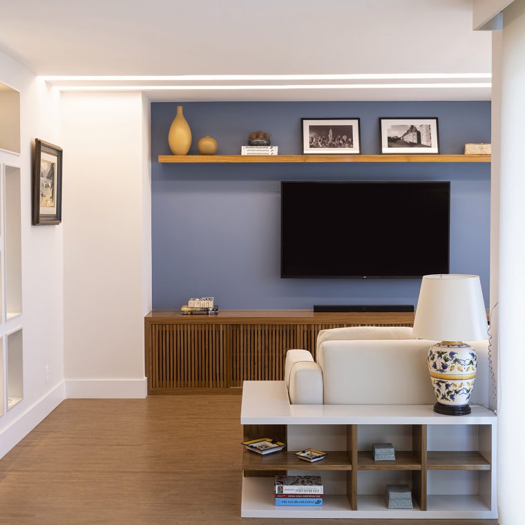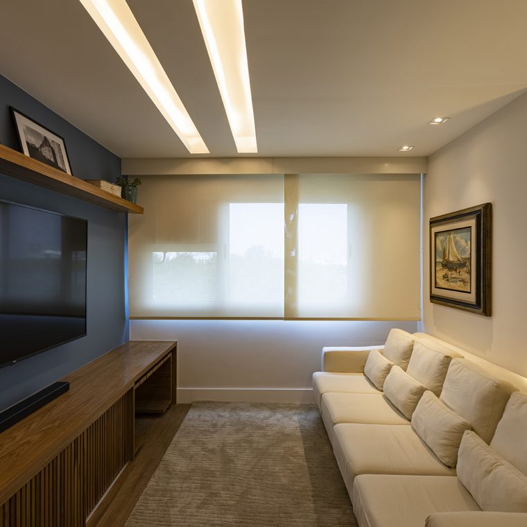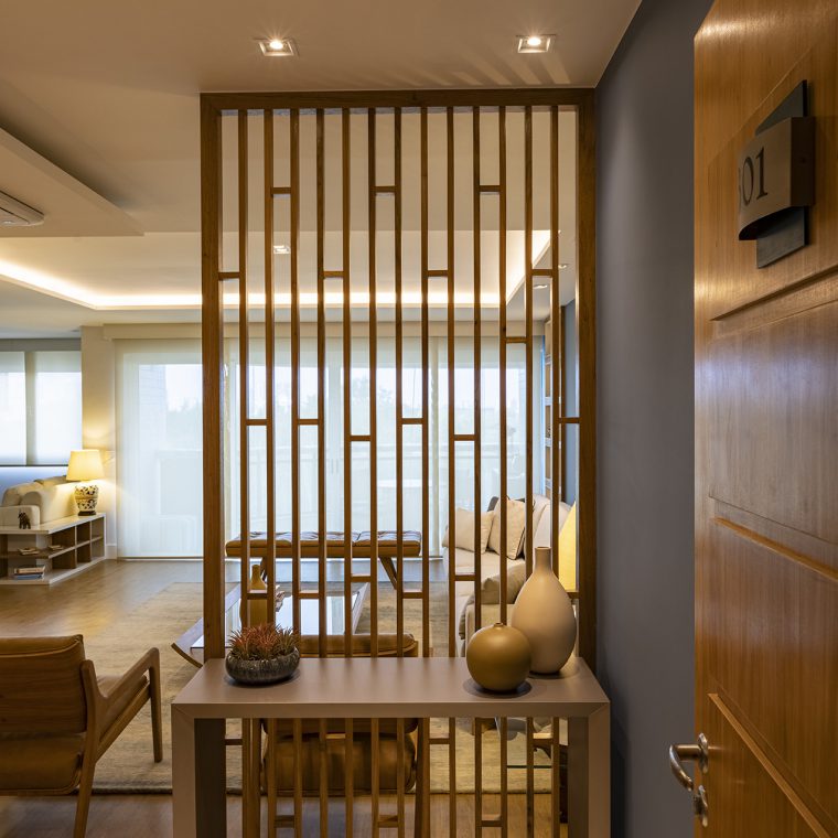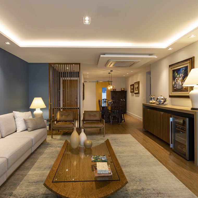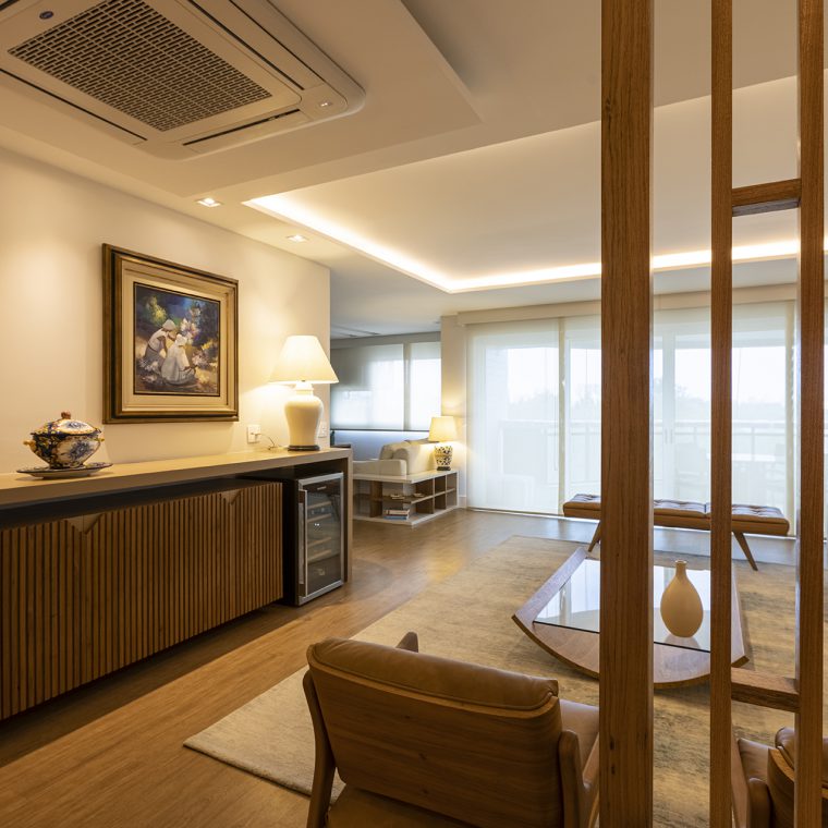 Perfil do projeto: O imóvel já tinha uma planta que atendia aos desejos dos clientes, por isso a única modificação feita por nós foi a união parcial das duas salas.