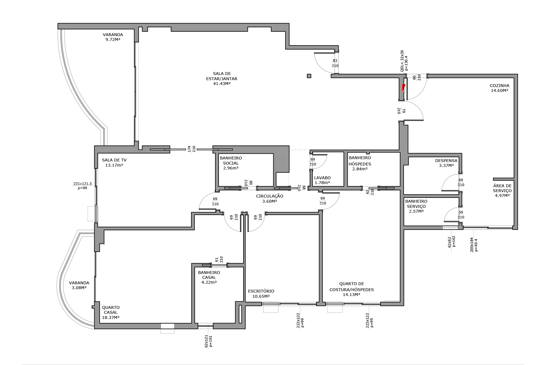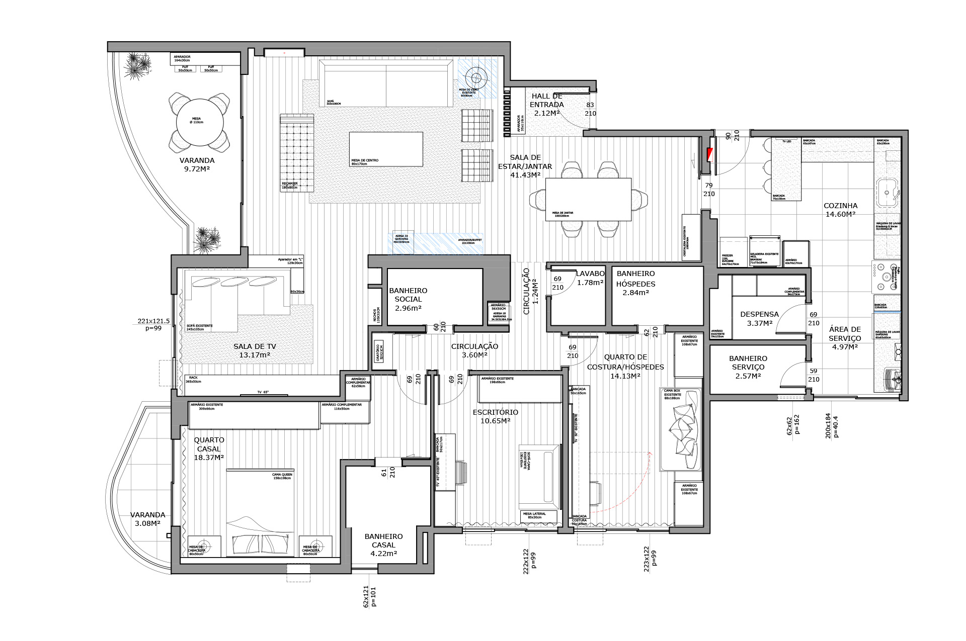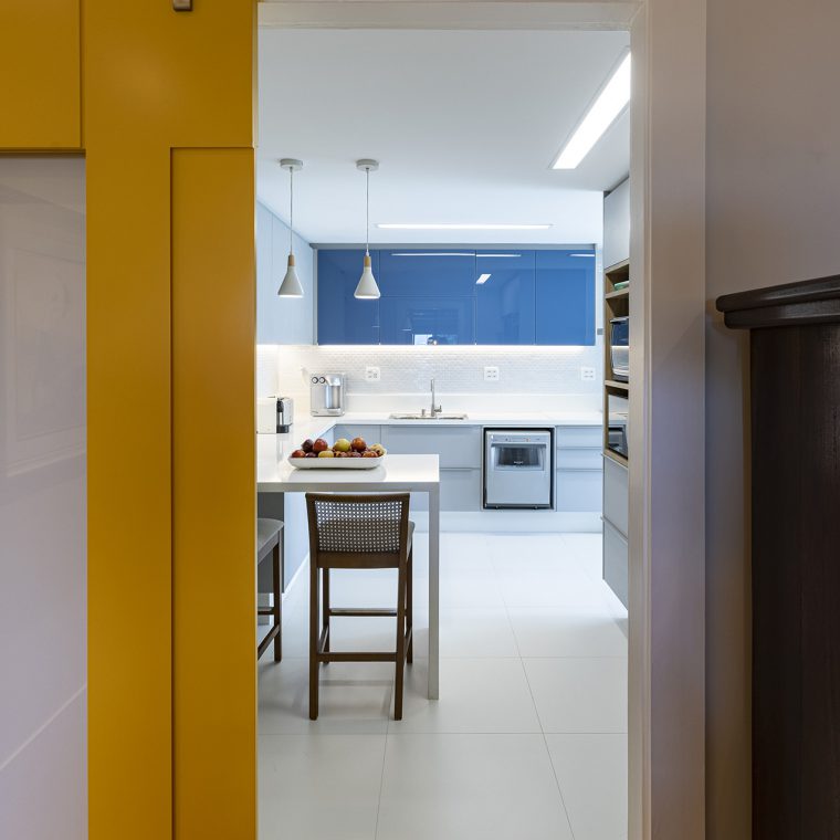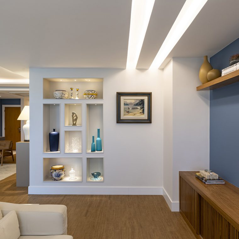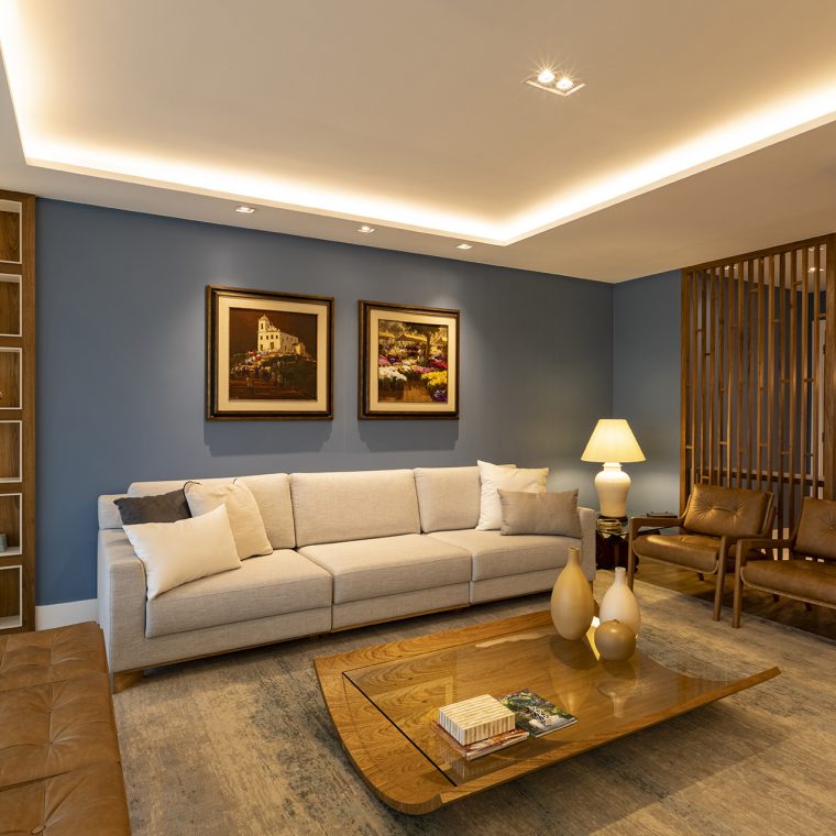 Perfil do projeto: O imóvel já tinha uma planta que atendia aos desejos dos clientes, por isso a única modificação feita por nós foi a união parcial das duas salas.