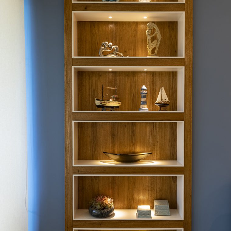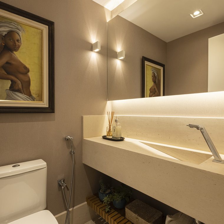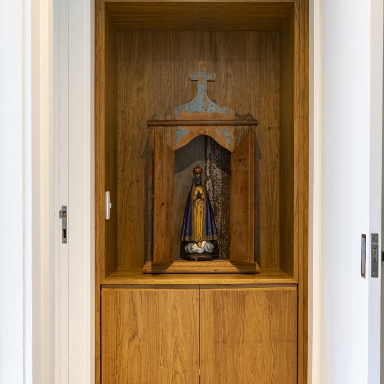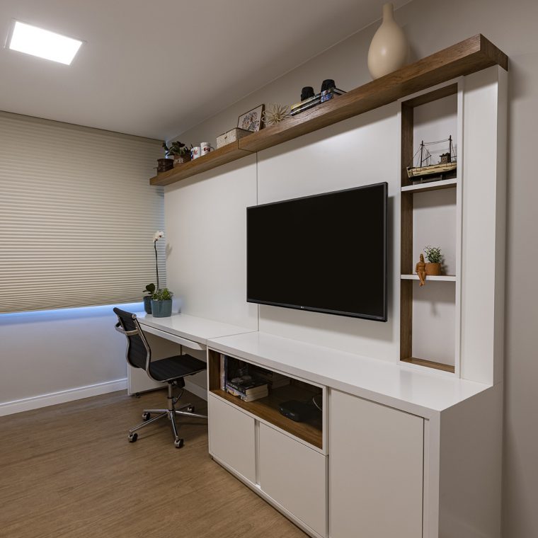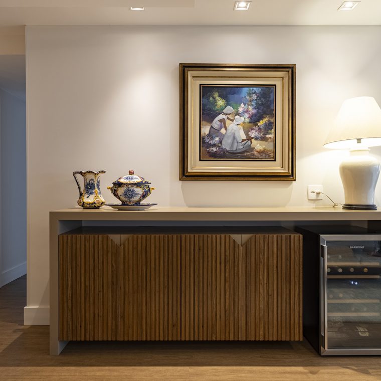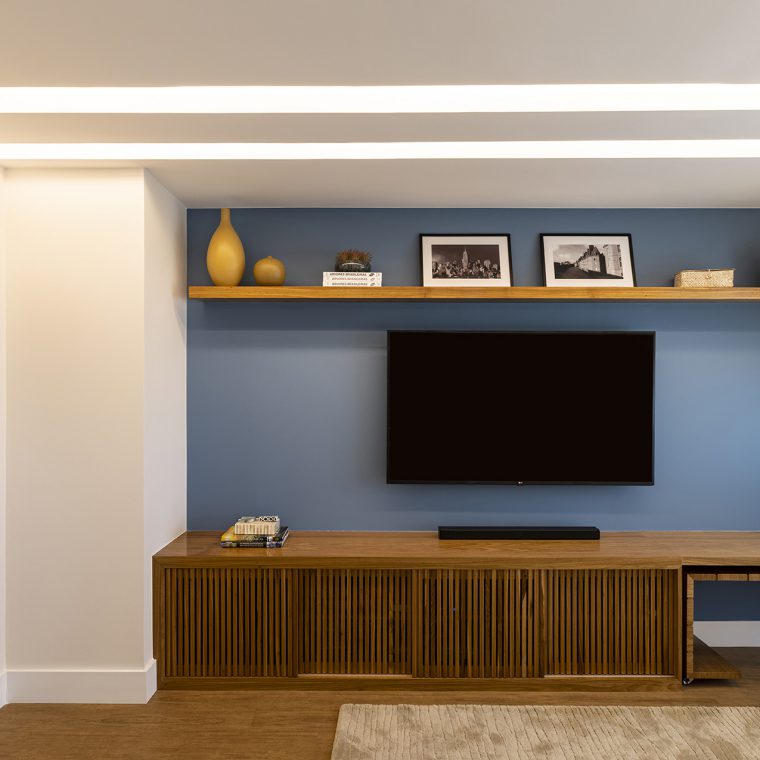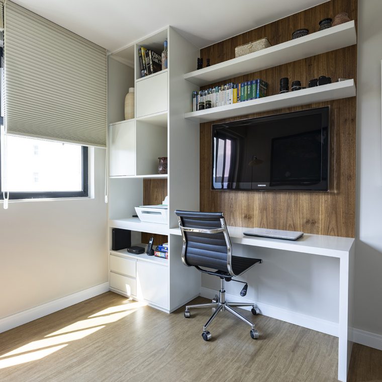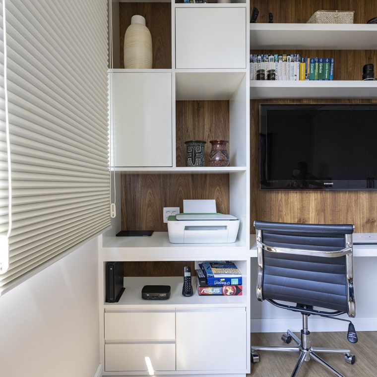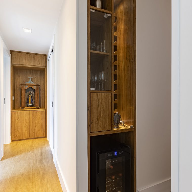 O charme do projeto fica por conta da marcenaria, que foi desenhada exclusivamente para cada cantinho. A folha escolhida para os móveis foi o freijó natural.
