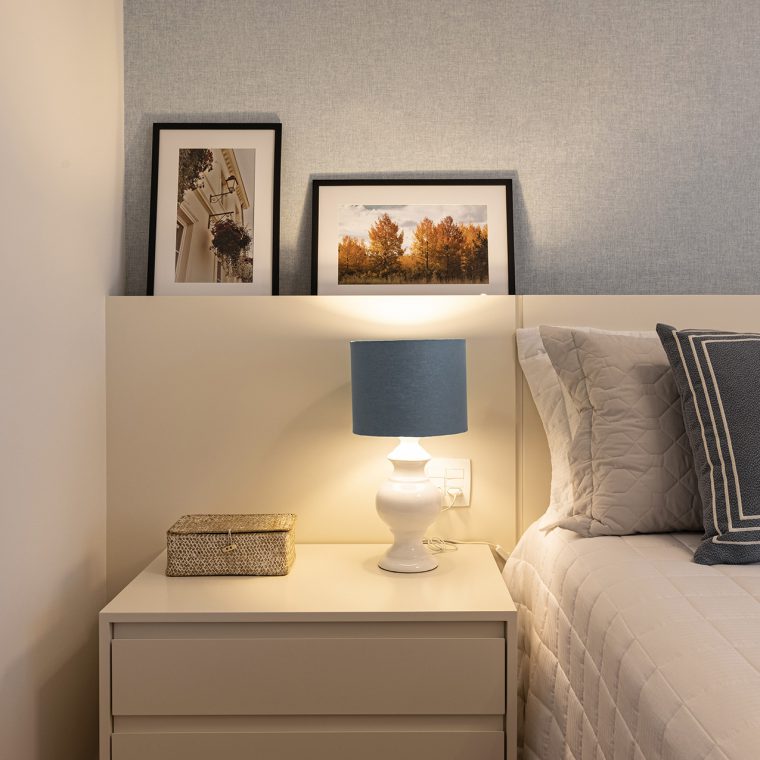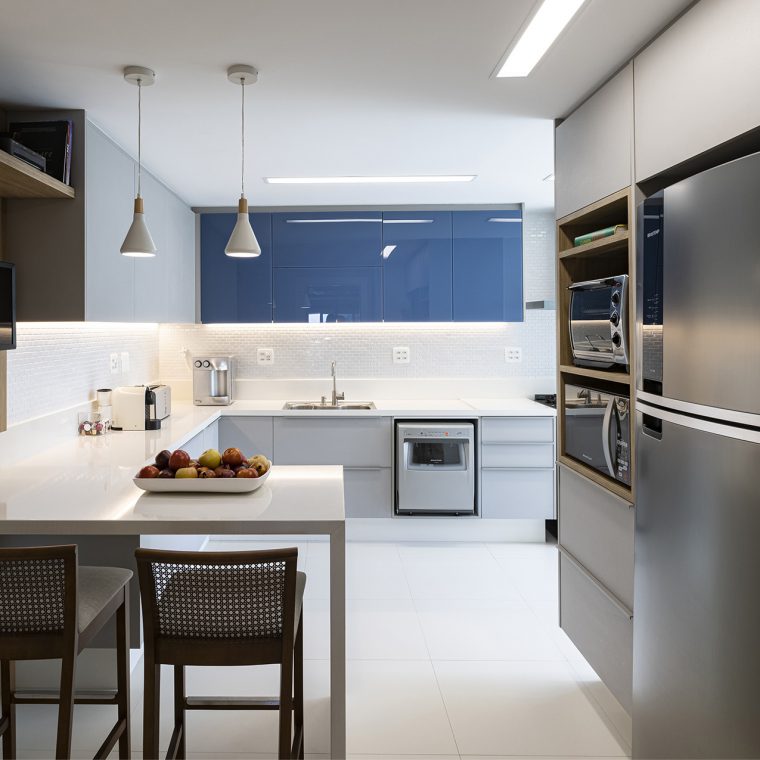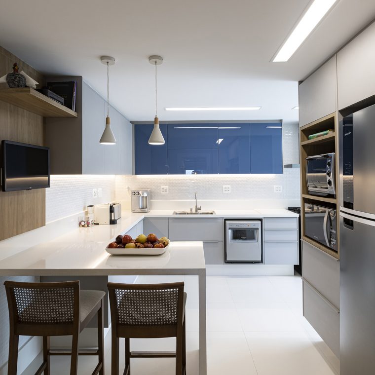A paleta de cor escolhida teve o azul como seu foco principal, pois era uma das cores que os clientes mais gostavam. No resto, optamos por usar revestimentos neutros e com cores mais atemporais.