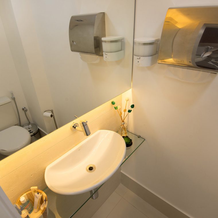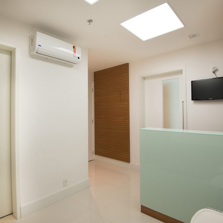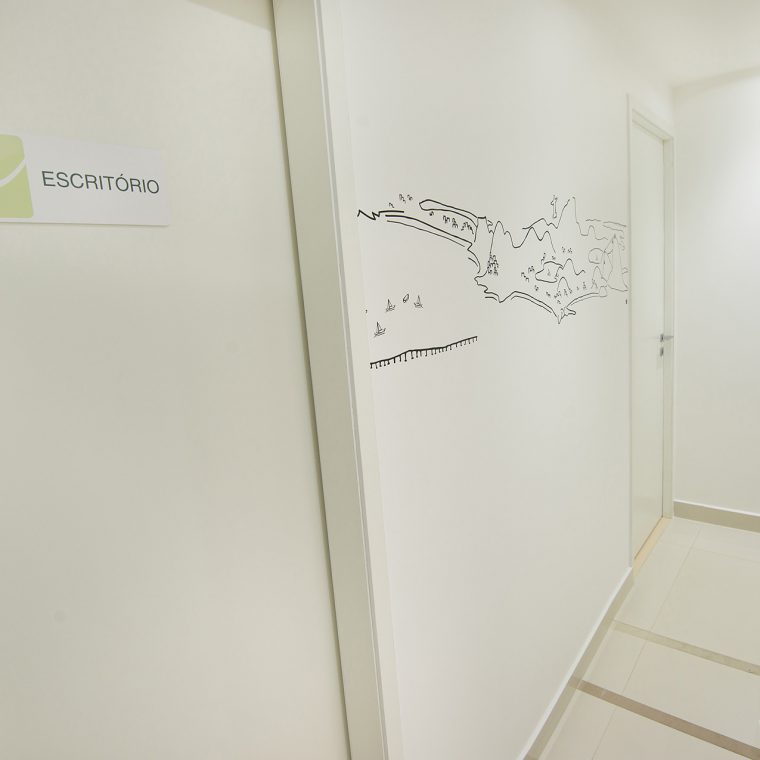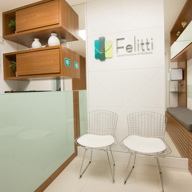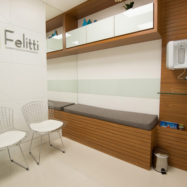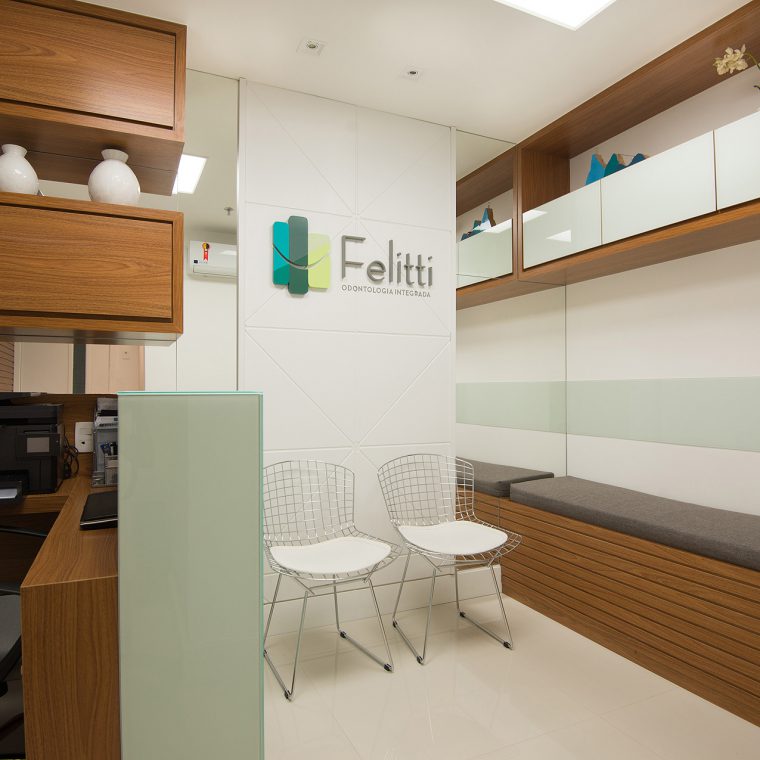 Perfil do projeto: O projeto tinha muitos desafios: adequar o extenso programa arquitetônico ao espaço disponível, criar um acesso de uso exclusivo e independente aos dentistas e definir os fluxos de forma objetiva. A recepção foi pensada para ser confortável e clara, por isso optou-se pelo uso de cores neutras. O destaque ficou para o logotipo da clínica, desenvolvido pelo designer Rafael Valpassos, que usa cores em sua composição e fica alocado em um painel da DECOPAINEL. O uso dos espelhos neste espaço também foi pensado para aumentar a sensação de amplitude. Toda marcenaria apresenta compartimentos “secretos” que auxiliam no armazenamento de arquivos e materiais de escritório e/ou papelaria. O espaço destinado para o escritório era um desejo da cliente. A intenção era ter um lugar planejado para o estudo nas horas vagas, onde também pudessem ser guardados os materiais de uso pessoal. Os dois consultórios, apesar de terem áreas semelhantes, apresentam algumas particularidades em função da especialidade do profissional que utiliza a sala para atendimento.