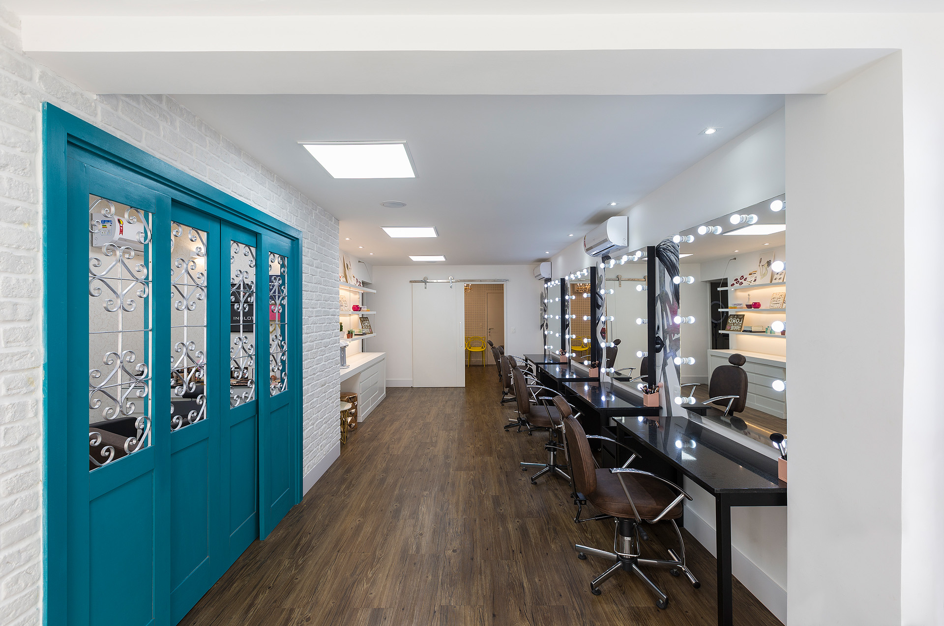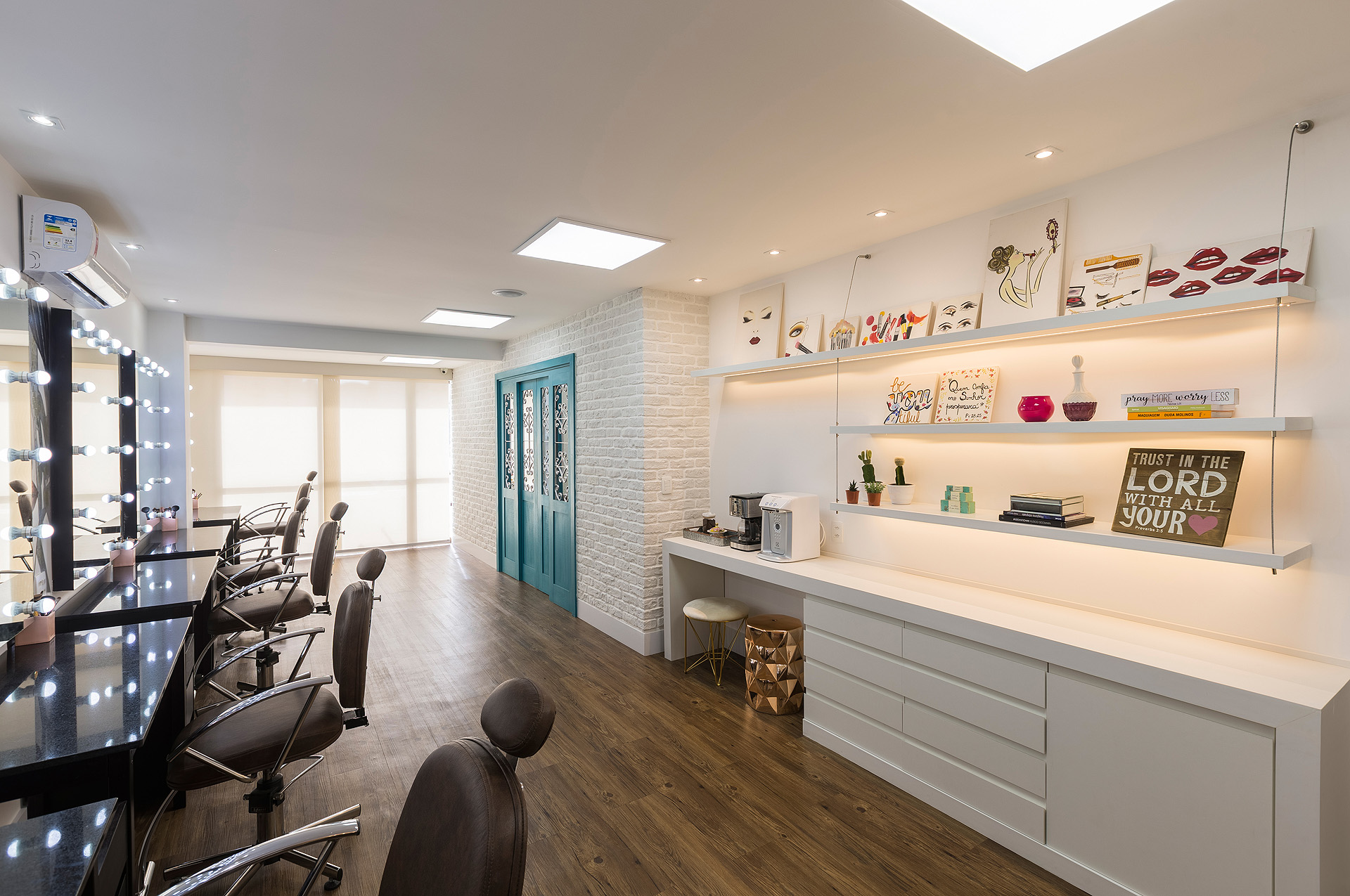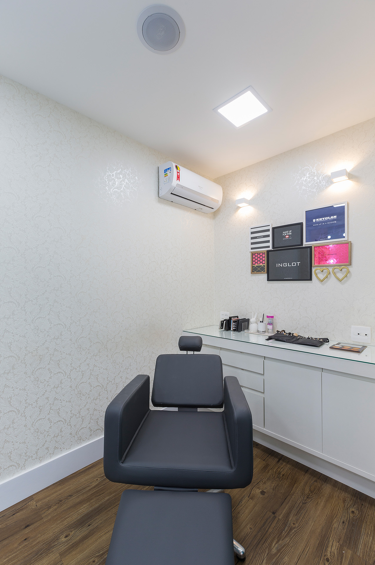 Perfil do projeto: Este projeto foi bem divertido e diferente de tudo que eu já havia feito. A proprietária já era minha cliente e o atelier tem uma história interessante porque é fruto da paixão dela (ex-farmacêutica) pelo mundo da maquiagem. Ela já tinha um atelier, em uma sala menor e, com o crescimento do negócio, buscou um novo espaço.
