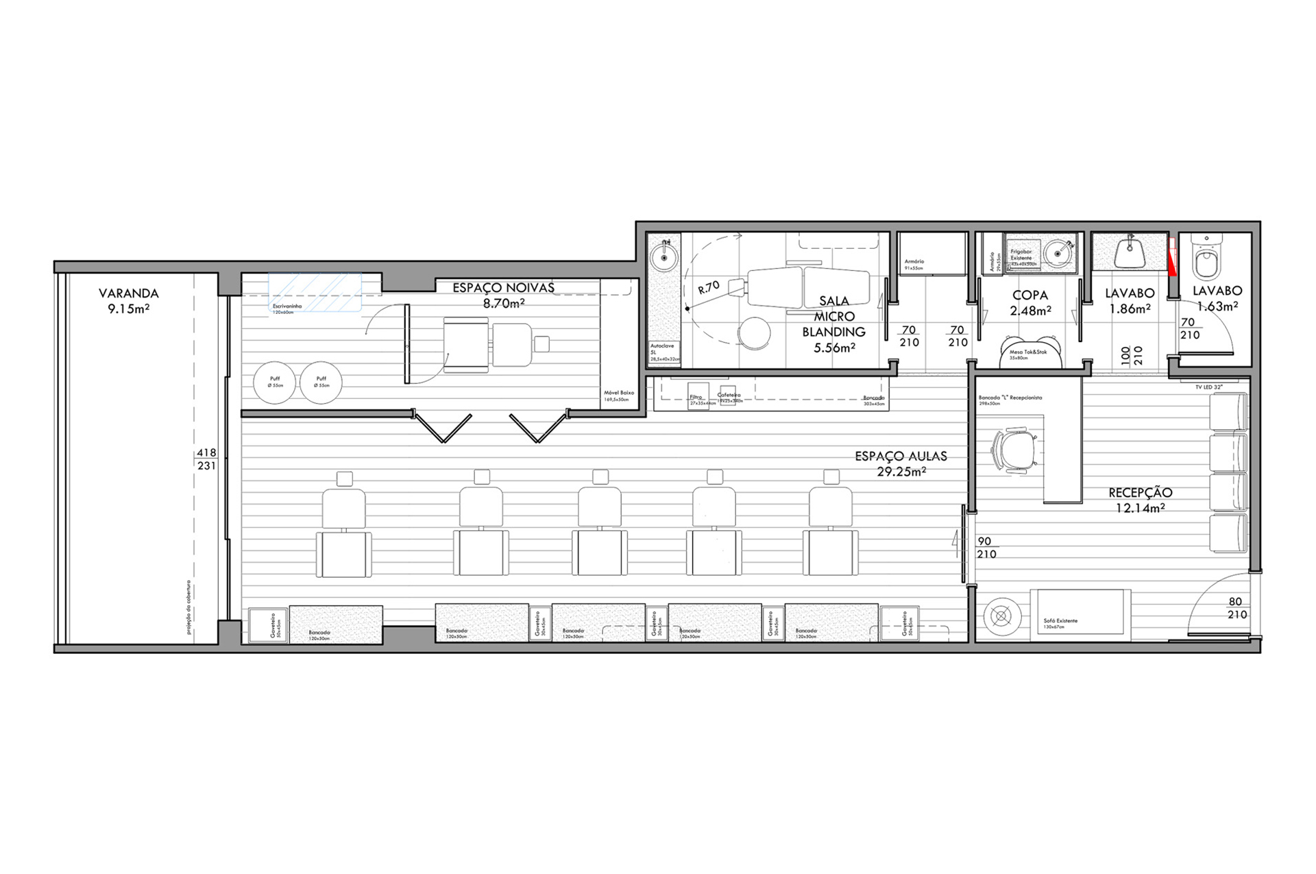 O programa arquitetônico foi definido para atender ao seu modelo de negócio. O mais importante era que os ambientes fossem confortáveis para as aulas e os cursos que ela ministra. Então, pensamos nas necessidades individuais: para cada aluna uma cadeira e um carrinho rodízio, além do espaço para guarda-volumes. Outro desejo era ter uma copa e um “mini” escritório. Esta esticada no layout só foi possível através da diminuição da varanda, que para o modelo de negócio dela, seria um lugar ocioso.