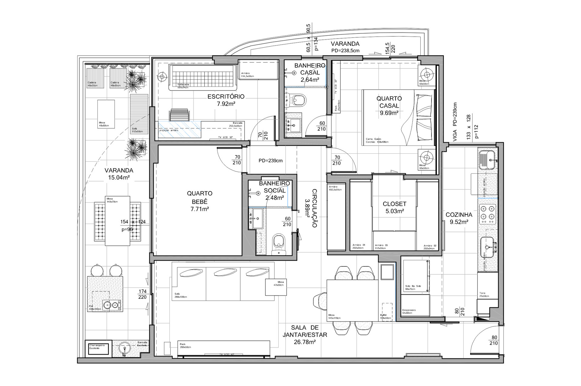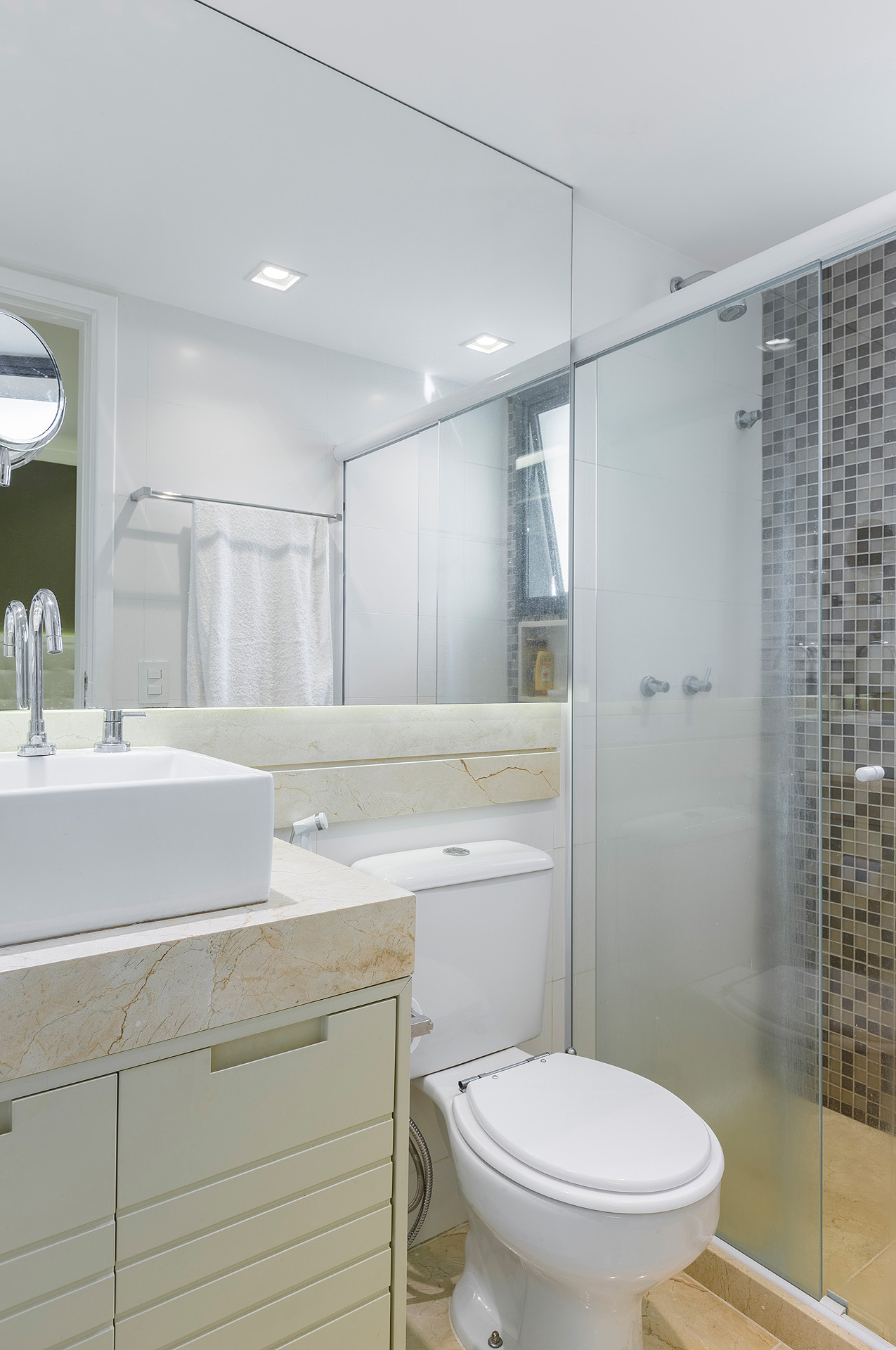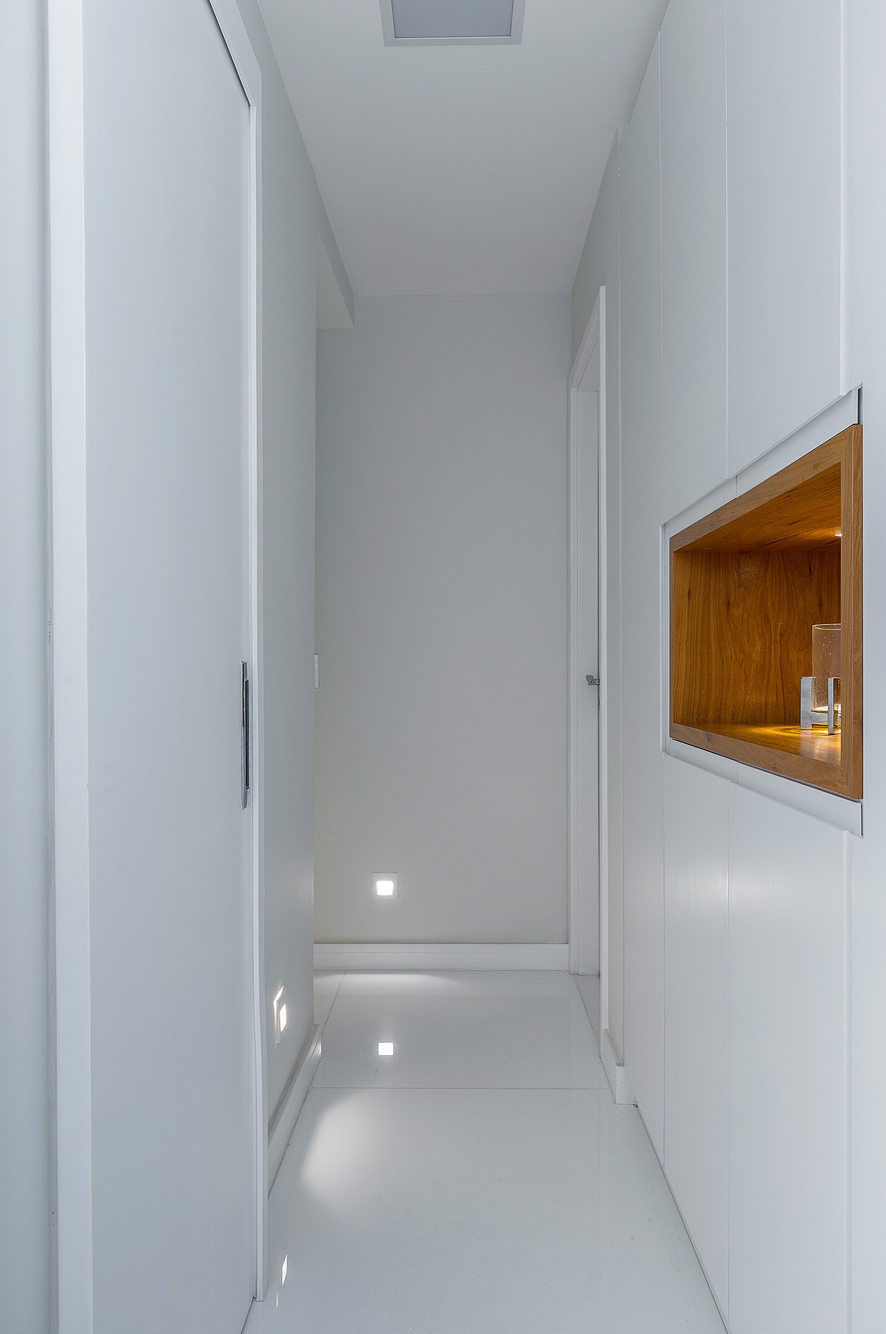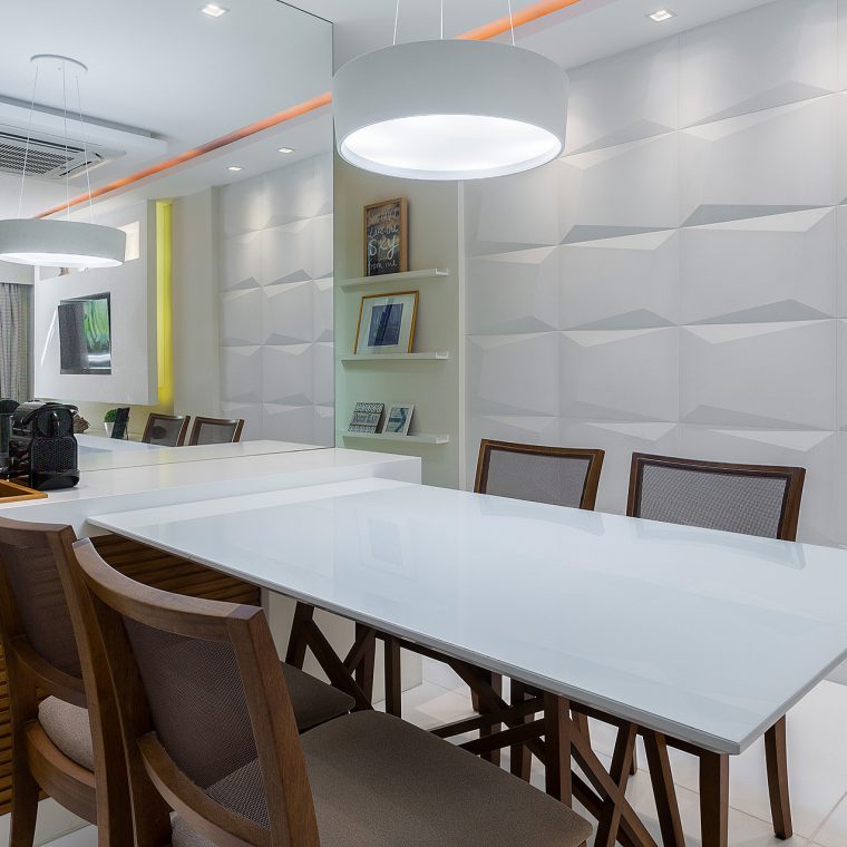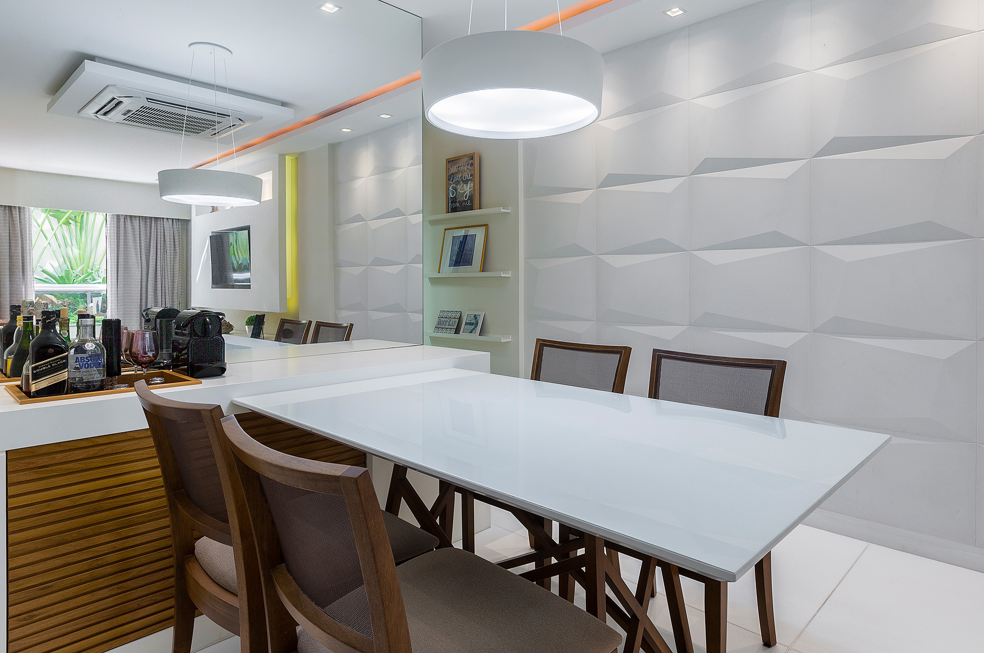 Perfil do projeto: O projeto arquitetônico desenvolvido para este casal, contemplou os estudos de layouts, projeto de iluminação, ajustes na elétrica e planejamento do mobiliário. Associado a esse “mix“, optou-se também pela troca de alguns acabamentos que valorizassem ainda mais os espaços: faixas de pastilhas de vidro PORTO DESIGN foram colocadas nos banheiros, e um painel de revestimento da CASTELLATO foi escolhido para a sala de jantar. Além disso, os móveis desenhados exclusivamente para cada espaço foram executados pelas marcenarias JJ Marcenaria e Marcenaria Pessanhae e pela loja de planejados Roma Mobili.