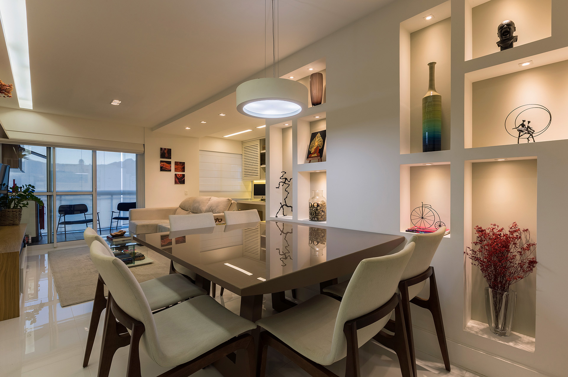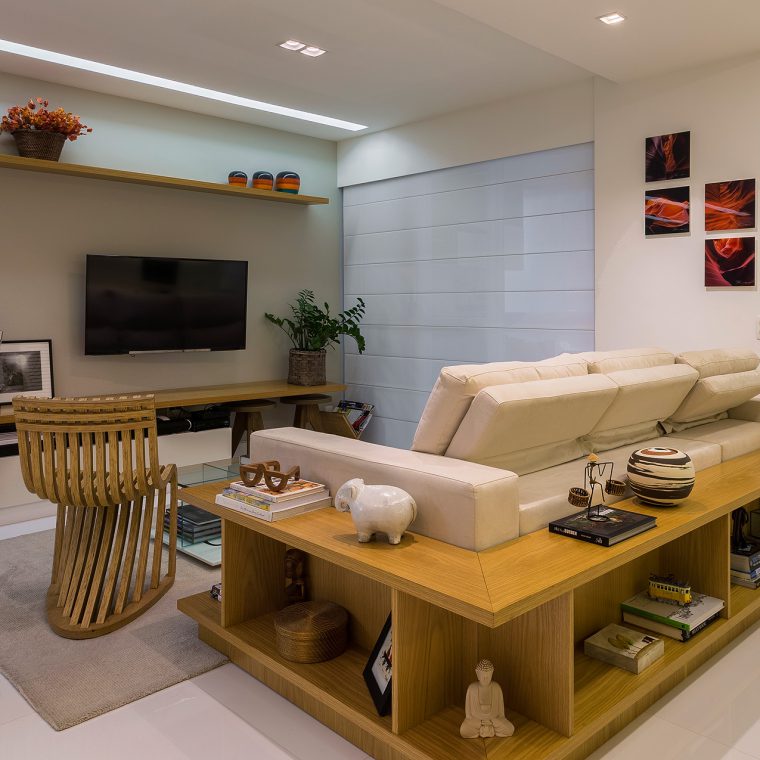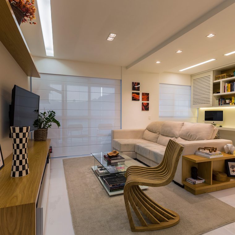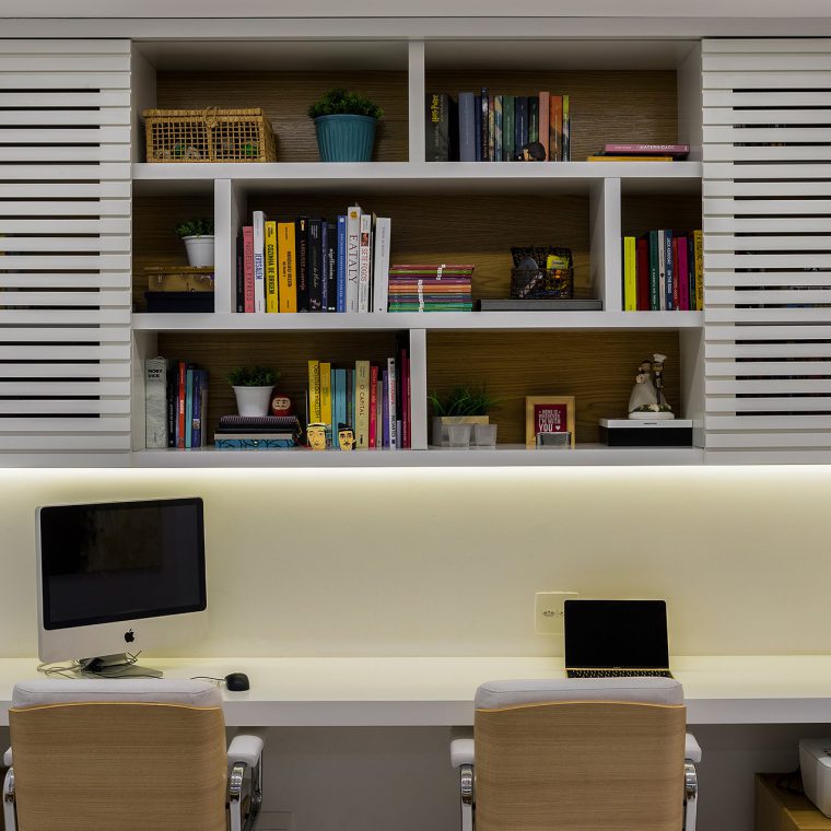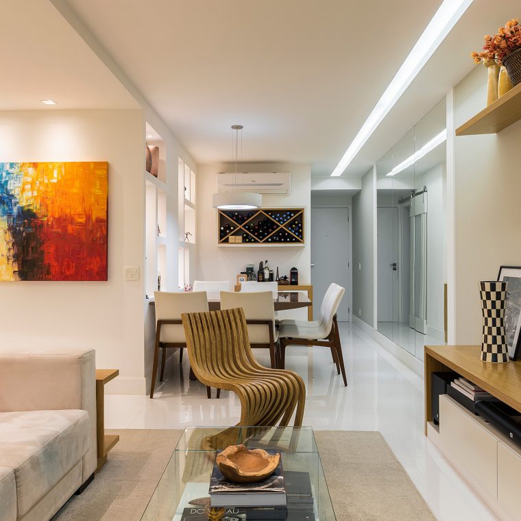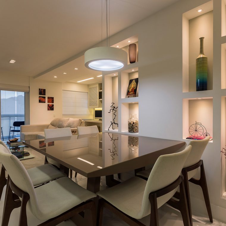 Com a modificação da planta, a área de serviço ficou mais confortável e o que restou do quarto de serviço foi transformado em um depósito. Já na sala, trocou-se o revestimento de todo piso, por um porcelanato de formato maior e mais claro, a fim de favorecer a ampliação visual do espaço. Para este casal a sala, além de abrigar a função de estar e jantar, deveria ter um canto de home-office. Esta interação visual de espaços com funções tão diferentes só foi possível, através da marcenaria exclusiva. Um elemento interessante do projeto é a parede de nichos que compõem a sala de jantar. Ela foi criada para disfarçar um pilar que existe neste canto da sala.