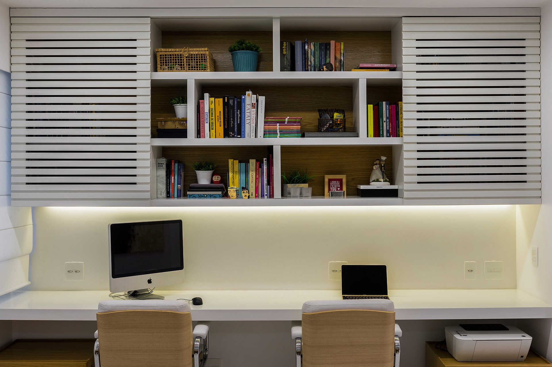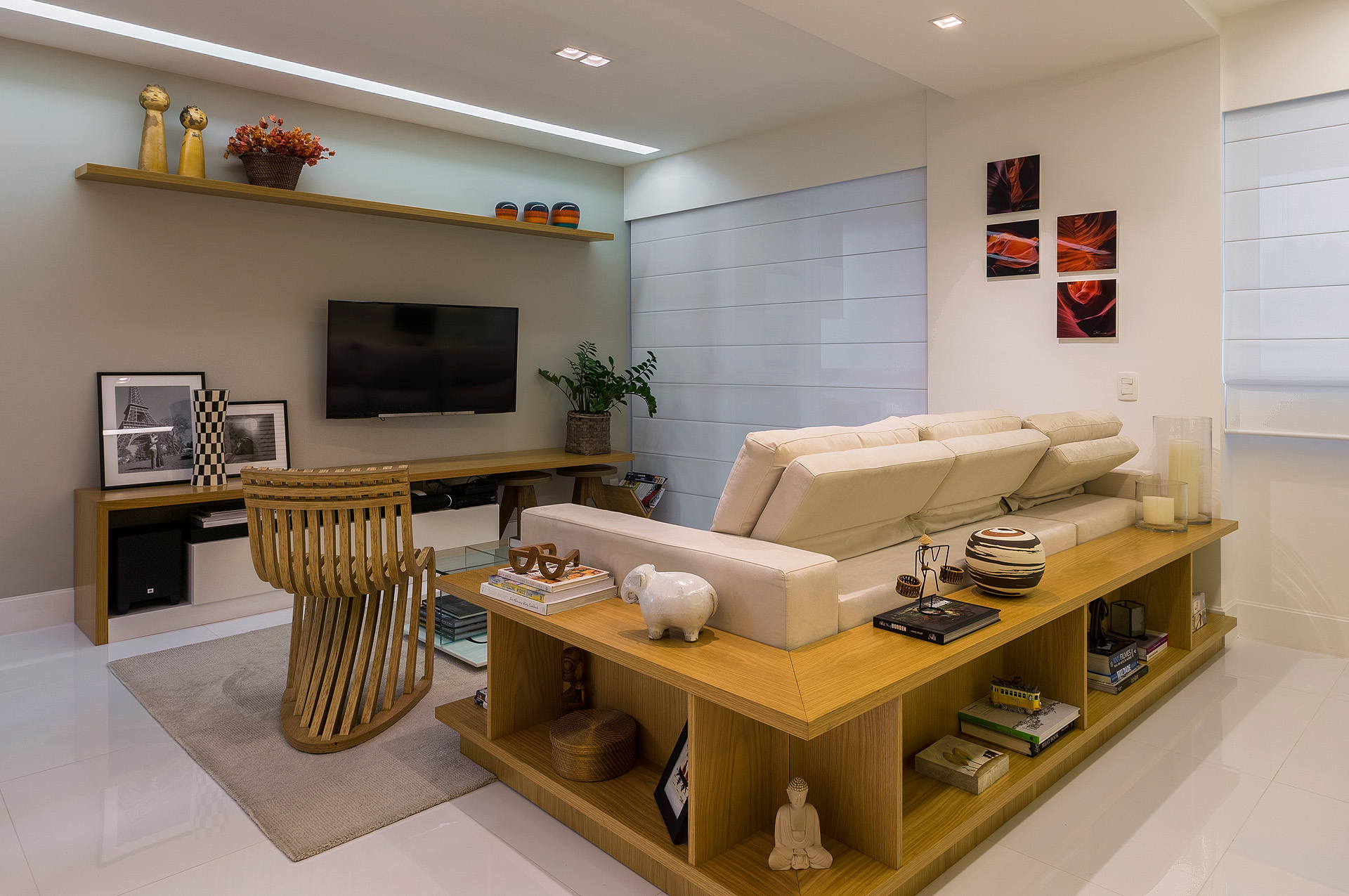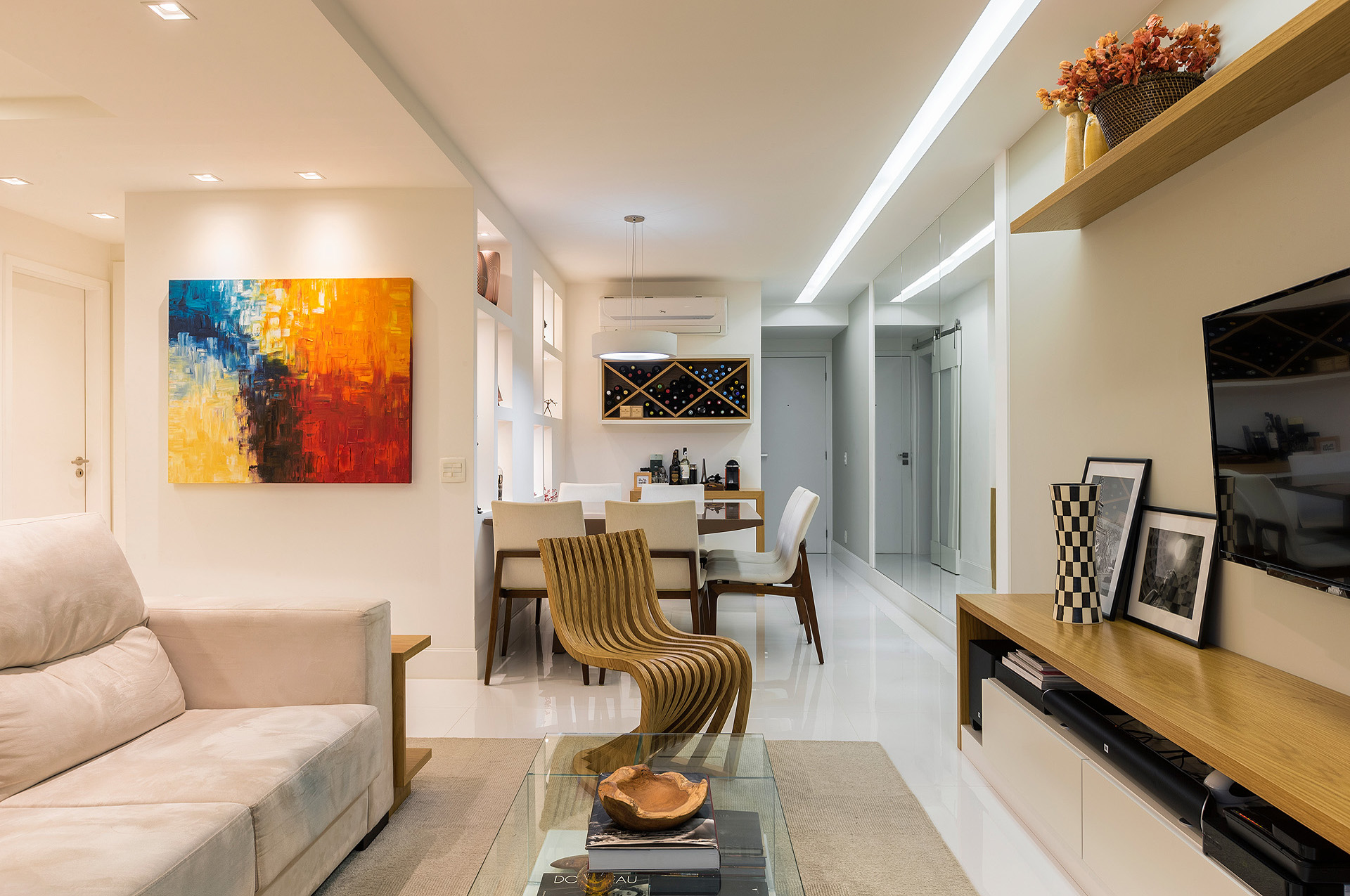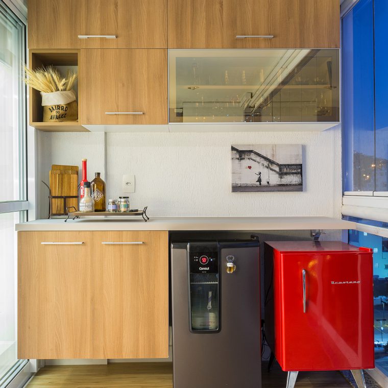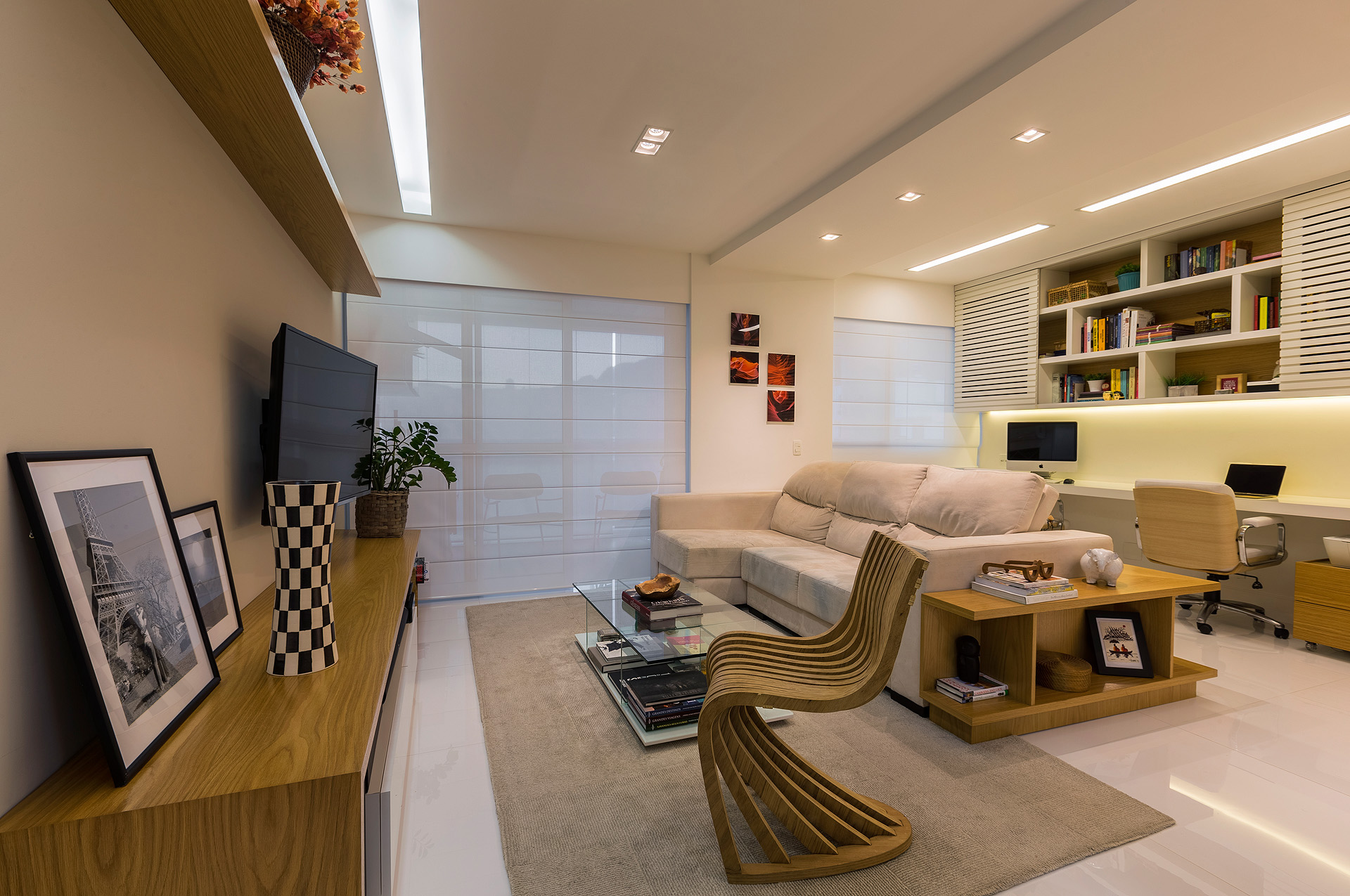 Com a modificação da planta, a área de serviço ficou mais confortável e o que restou do quarto de serviço foi transformado em um depósito. Já na sala, trocou-se o revestimento de todo piso, por um porcelanato de formato maior e mais claro, a fim de favorecer a ampliação visual do espaço. Para este casal a sala, além de abrigar a função de estar e jantar, deveria ter um canto de home-office. Esta interação visual de espaços com funções tão diferentes só foi possível, através da marcenaria exclusiva. Um elemento interessante do projeto é a parede de nichos que compõem a sala de jantar. Ela foi criada para disfarçar um pilar que existe neste canto da sala.