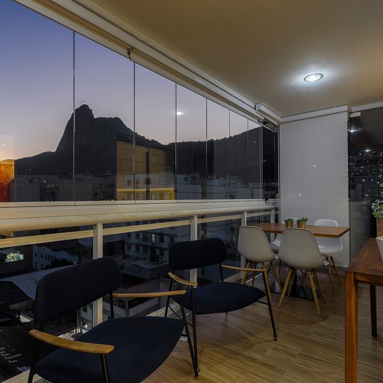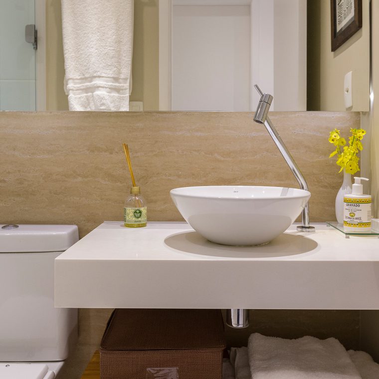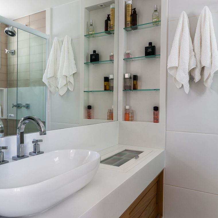 No banheiro de casal, aplicou-se pastilhas de vidro fosca 10x30cm da VÍTRICA no box e remodelou-se a bancada. Esta passou a ter um porta-maquiagem embutido. A varanda com vista para o Cristo foi envidraçada e teve seu piso substituído por porcelanato amadeirado. Na decoração, escolha dos objetos é crédito total da cliente!