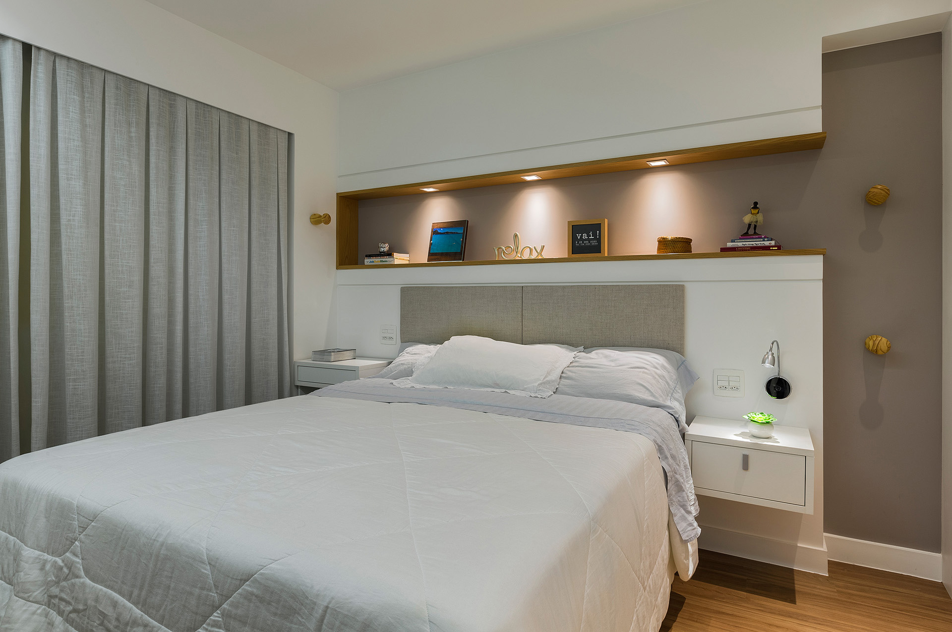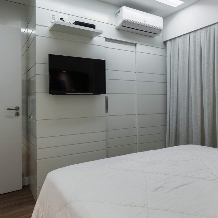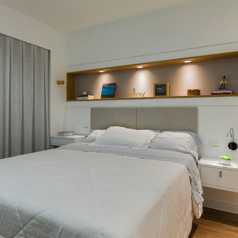 O layout do quarto do casal foi outro detalhe desafiador. Para disfarçar a porta do banheiro abrindo de frente para a cama, foi desenhado um painel de marcenaria com uma porta de correr embutida.