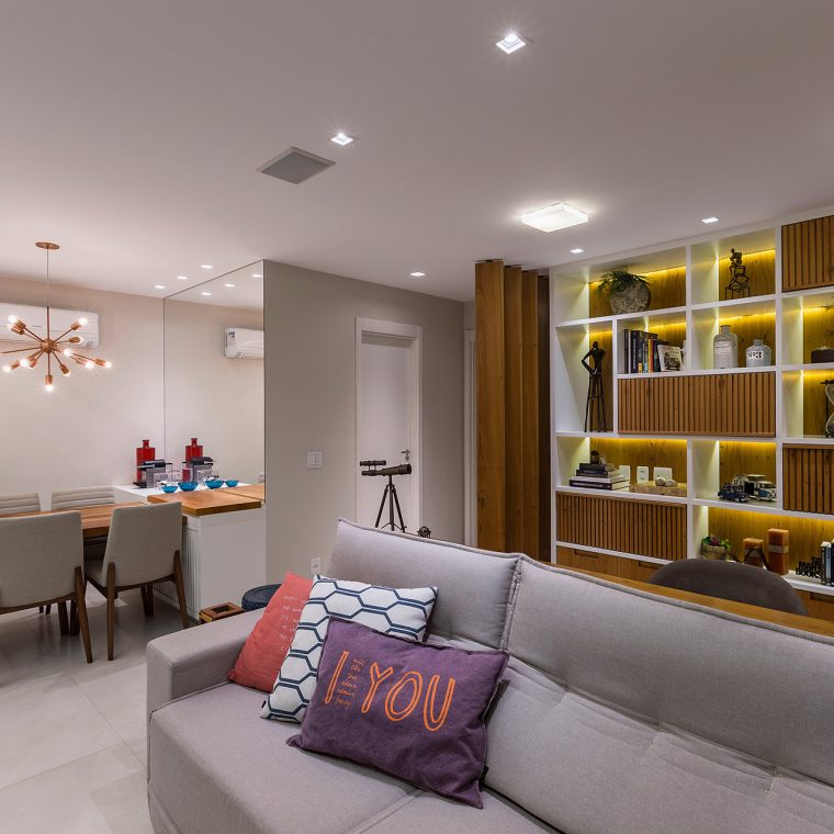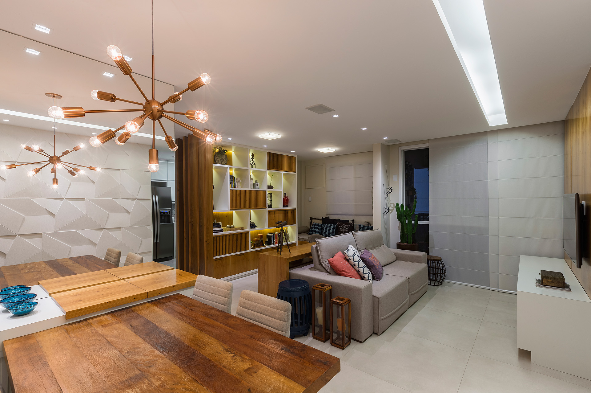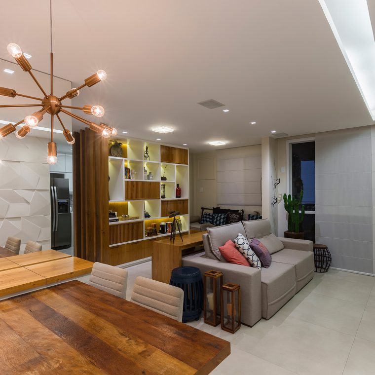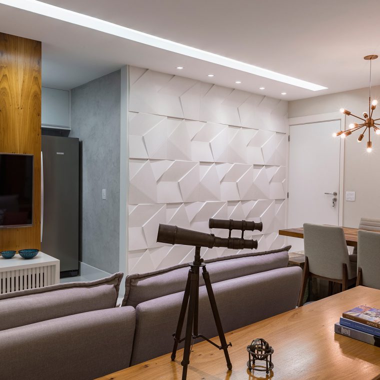 Perfil do projeto: Apesar do apartamento ser novo, o desejo do casal era uma reforma total. A planta entregue pela construtora não sofreu alteração. A curiosidade deste imóvel, é que ele se transformou em um apartamento extremamente funcional e confortável mesmo tendo apenas um único quarto. Um desejo da cliente era usar um painel da CASTELATTO e este foi colocado logo no hall de entrada, fazendo o fundo da sala de jantar. O painel se tornou, junto com a marcenaria, o astro principal da casa.