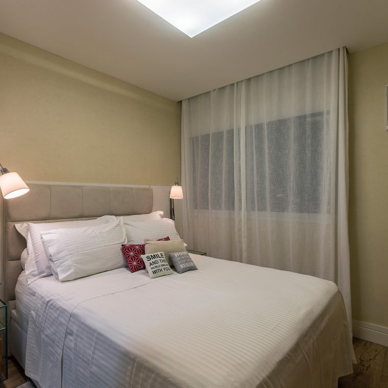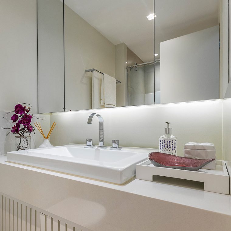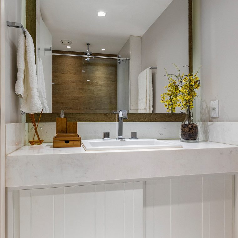 Nos banheiros, porcelanatos PORTOBELLO associados a paredes em pintura. Para o banheiro social misturou-se madeira com branco e para o banheiro da suíte foi utilizado apenas uma tonalidade de revestimento. No quarto do casal, optou-se pela instalação de um closet. Um truque utilizado para ter a entrada do closet disfarçada, foi espelhar toda lateral dele.
