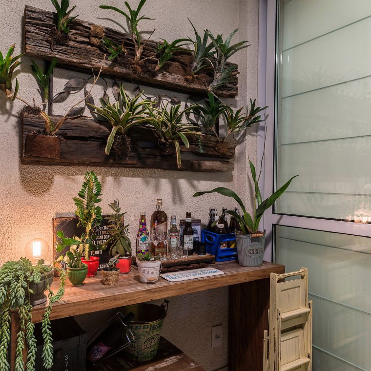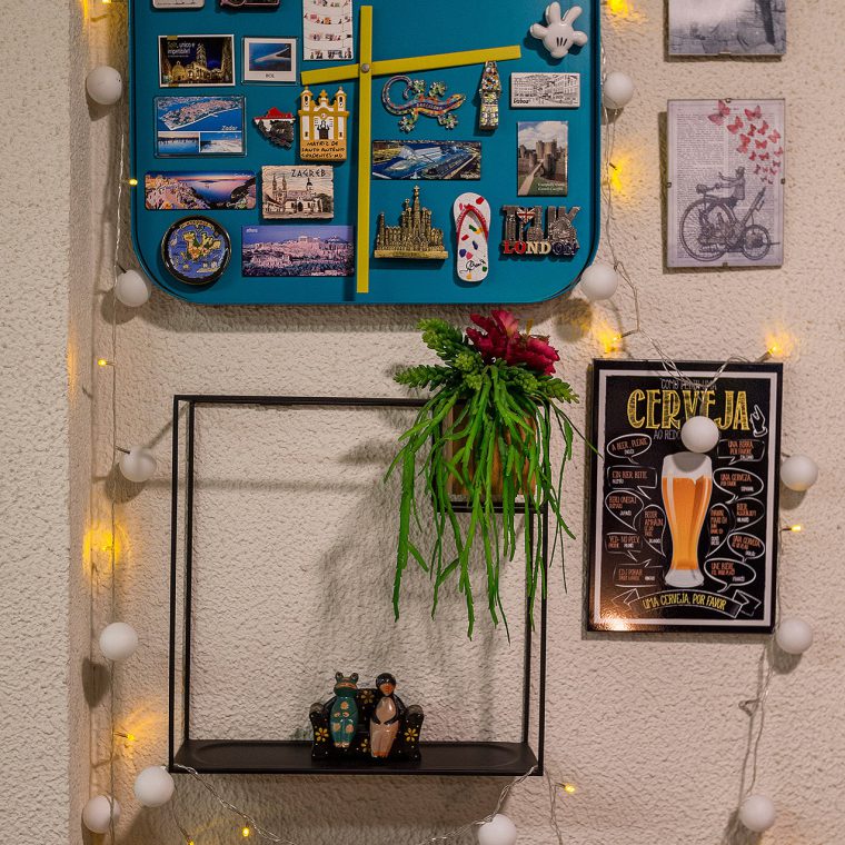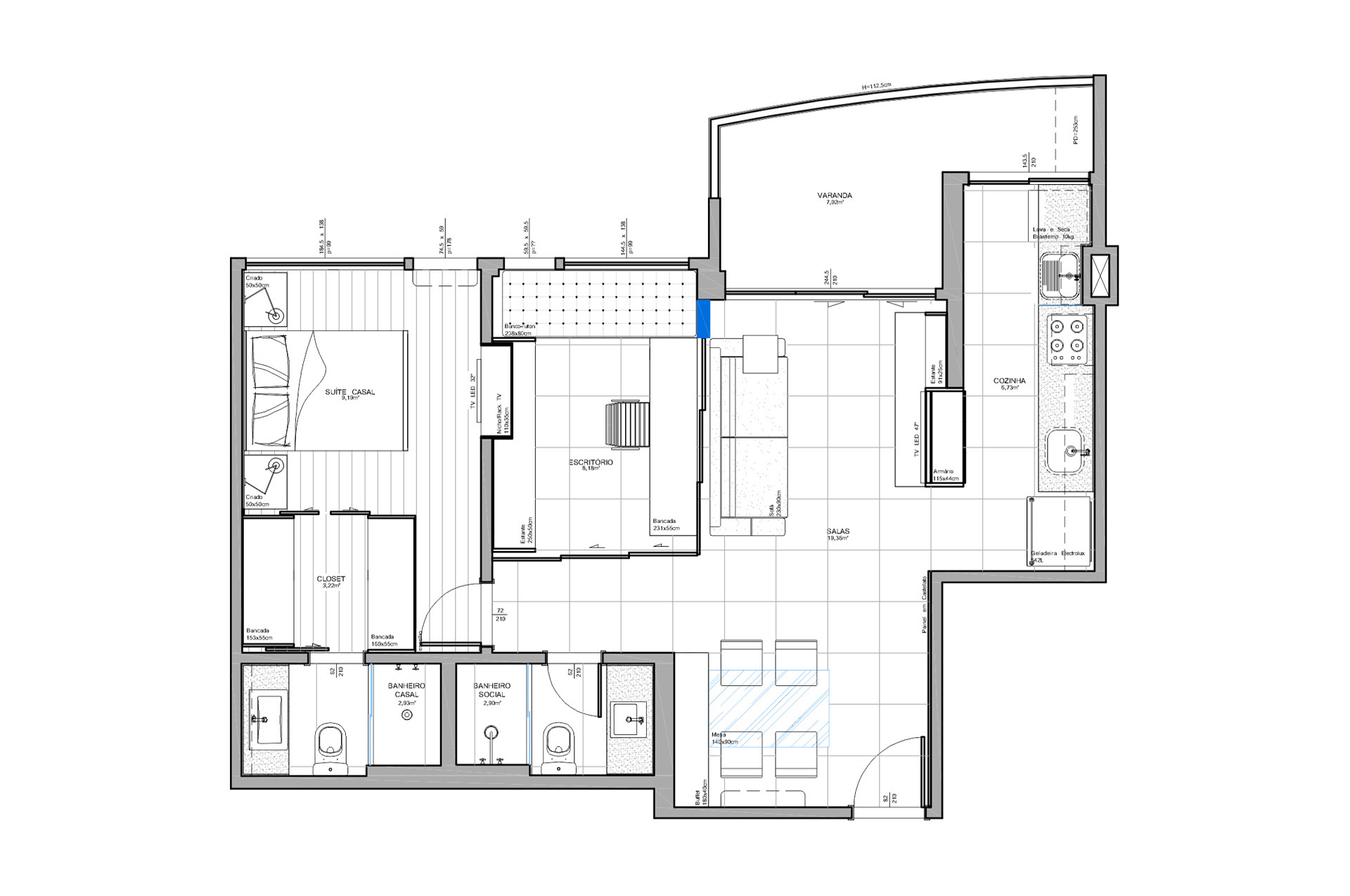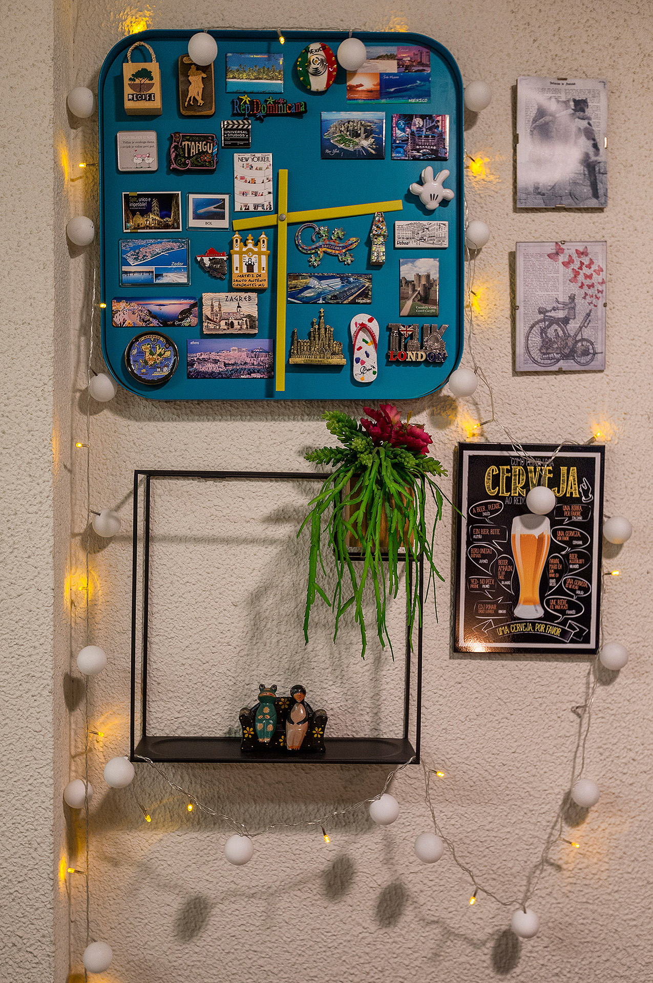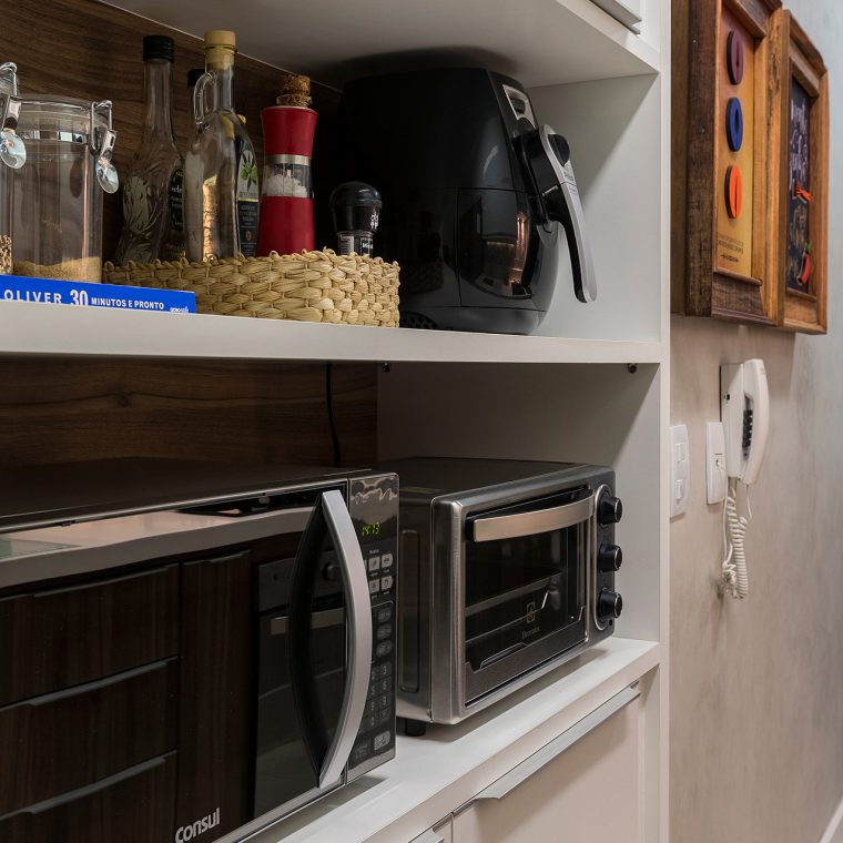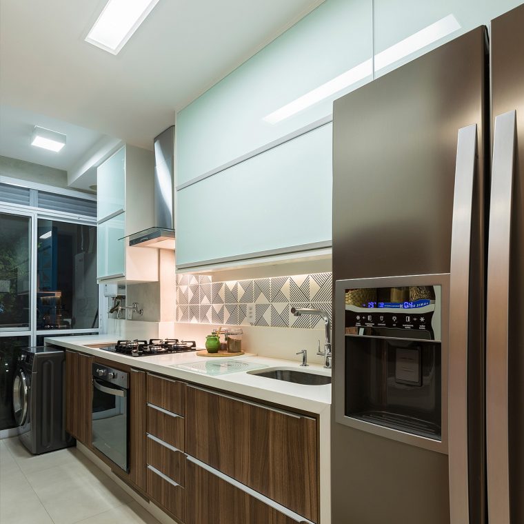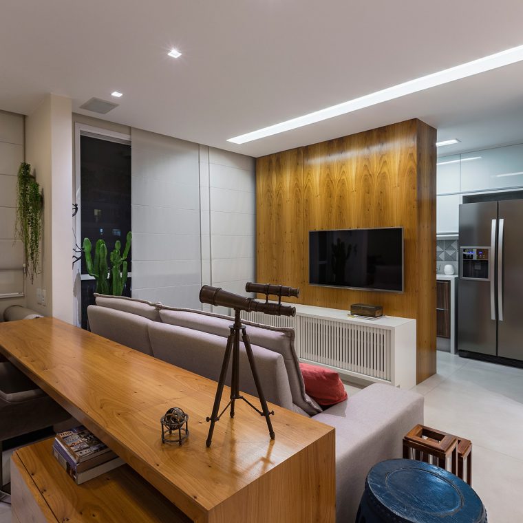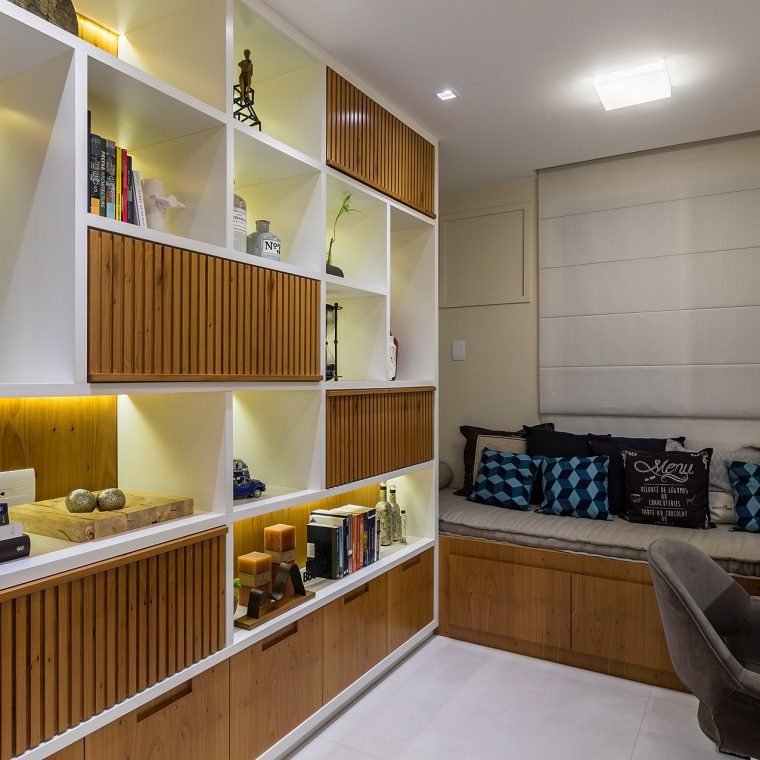 Outro ponto interessante do projeto é que a marcenaria desenvolvida cumpre dois papéis: o de dividir ambientes e camuflar espaços funcionais da casa, que servem de louceiro e rouparia. É o caso do painel da TV que serve tanto de divisória da sala com a cozinha quanto para esconder uma parte da coleção de copos, que fica escondida dentro dele. Além disso, uma parte de sua profundidade foi revertida para a cozinha, ampliando a quantidade de armários. A estante que ocupa toda parede do fundo da sala tem um desenho todo assimétrico. A mesma foi posicionada pensando em uma futura possibilidade de um segundo quarto. A escolha pelo azulejo de grafismo LURCA na cozinha foi para que ele tivesse um desenho similar ao painel da CASTELATTO instalado na sala.